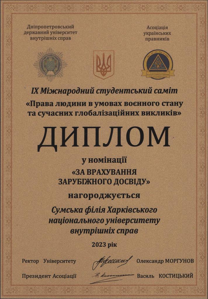 Під керівництвом доцента кафедри соціально-економічних дисциплін Світлани Виганяйло магістрантка 1 курсу спеціальності «Правоохоронна діяльність» Інна Шалова взяла участь у ІХ Міжнародному студентському саміті «Права людини в умовах воєнного стану та сучасних глобалізаційних викликів».