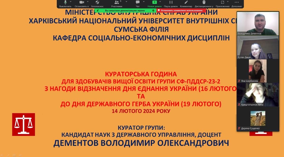 14 лютого 2024 року доцентом кафедри соціально-економічних дисциплін Сумської філії ХНУВС Володимиром Дементовим згідно з планом роботи куратора було організовано та проведено кураторську годину зі студентами групи СФ-ПДдср-23-2 з нагоди відзначення Дня єднання України та до Дня Державного герба України.