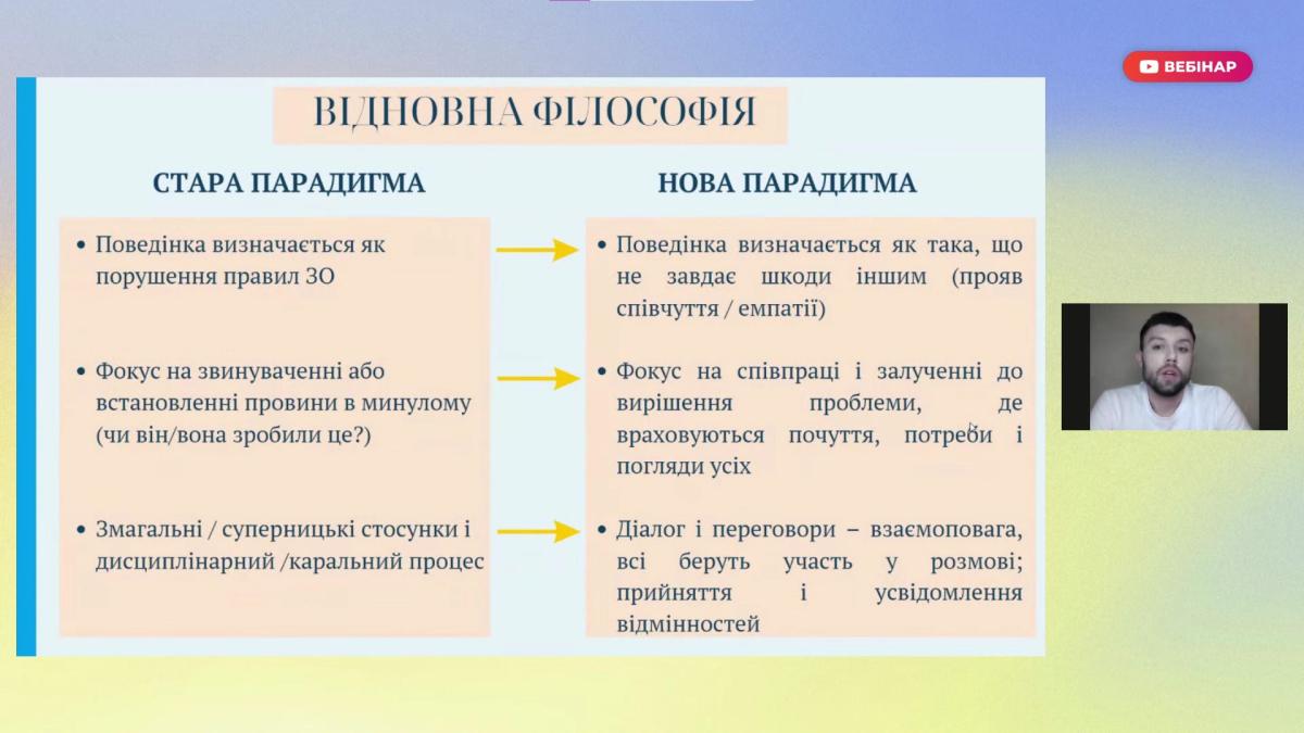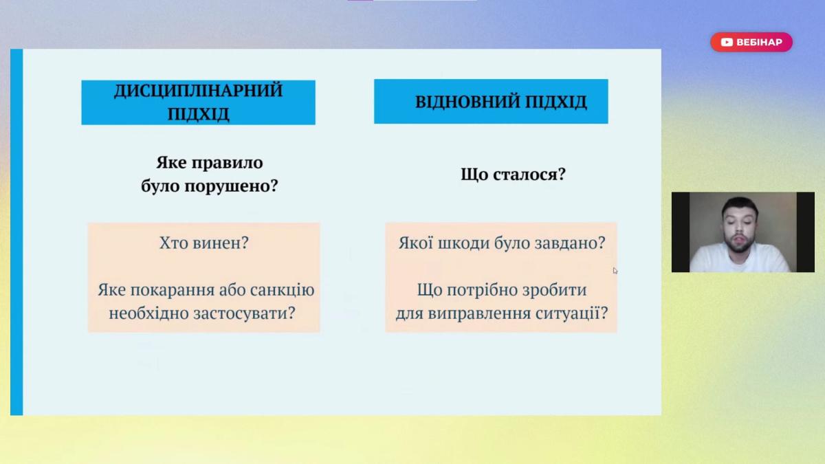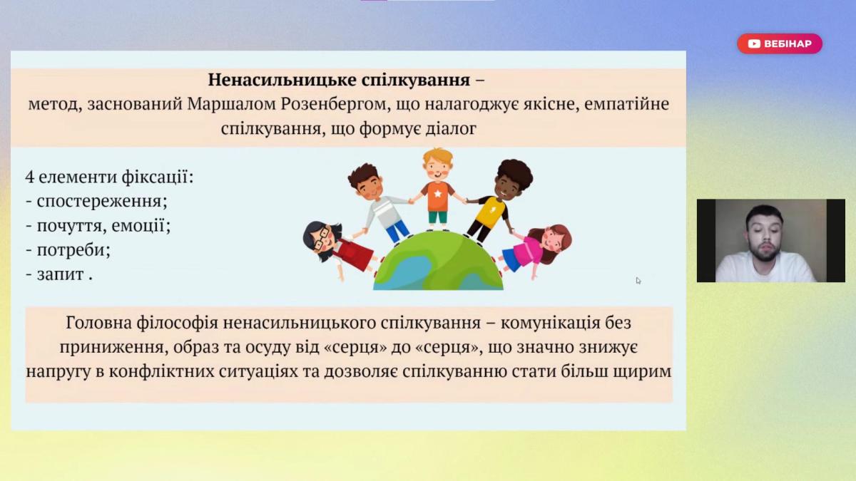 Спікер вебінару, Олександр Черкас, громадський діяч, голова громадської організації «Не цькуй», міжнародний експерт із протидії цькування, психолог, педагог, дослідник, висвітлив практичні ракурси й алгоритм застосування несилових методів протидії булінгу в закладі освіти.