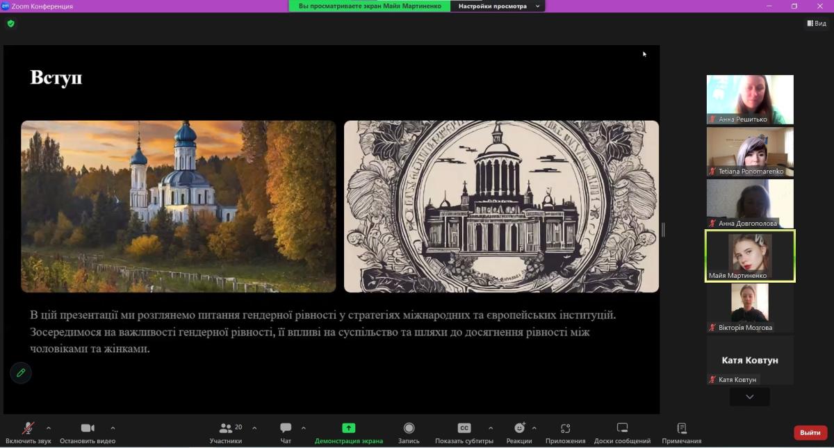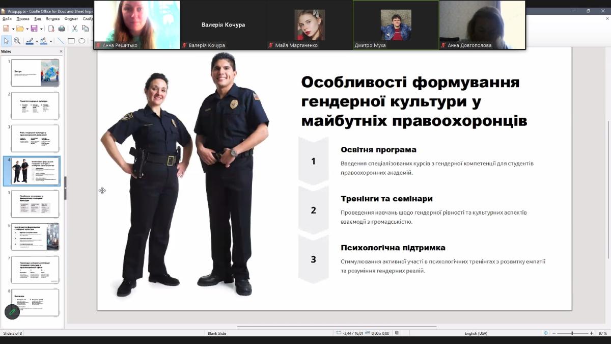 Під керівництвом старшого викладача кафедри Анни Решитько здобувачами вищої освіти підготовлено змістовні наукові доповіді. Так, Майа Мартиненко висвітлила питання гендерної рівності у стратегіях міжнародних та європейських інституцій; Дмитро Муха презентував особливості формування гендерної культури майбутніх правоохоронців у контексті євроатлантичної інтеграції; Кіріл Тросюк окреслив питання гендерної рівності у сучасному світі.