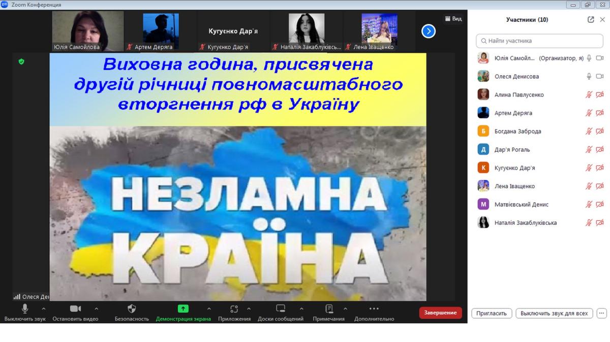 24 лютого 2022 року…День, який назавжди залишиться в серцях усіх українців…Дата, що назавжди буде пов’язана з болем за свою країну… В цьому році минає вже 2 роки з моменту повномасштабного вторгнення рф в Україну. Саме цьому дню була присвячена виховна година зі студентами кураторської групи СФ-ПДдср-22-1, проведена доцентом кафедри гуманітарних дисциплін Сумської філії ХНУВС Юлією Самойловою.