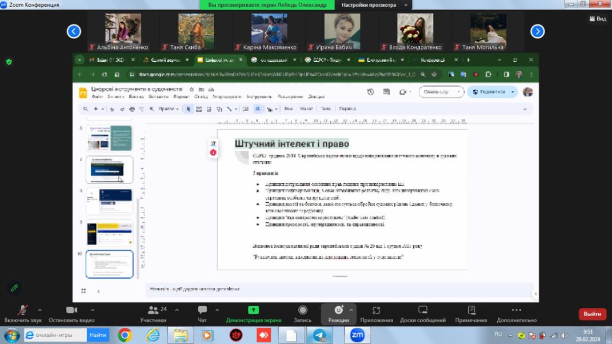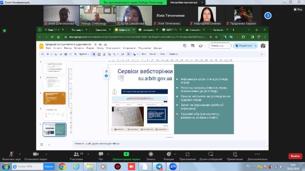 Під час проведення заняття особливу увагу було приділено специфіці роботи Господарського суду Сумської області, особливостям користування системою Електронний суд, сучасним інноваційним цифровим інструментам у роботі юриста, а також поговорили про можливості, місце і роль використання систем штучного інтелекту в системі судочинства України.