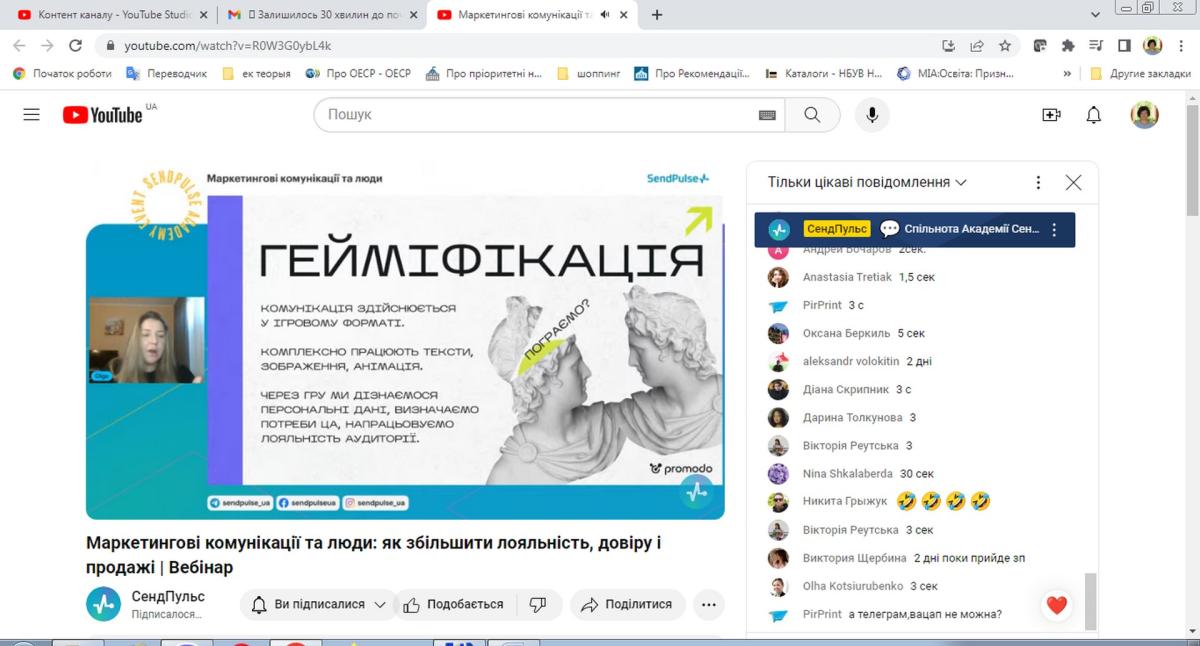 Інтерактивна взаємодія доповідачки з аудиторією за допомогою чату, яскраві приклади забезпечили живий інтерес до матеріалу.