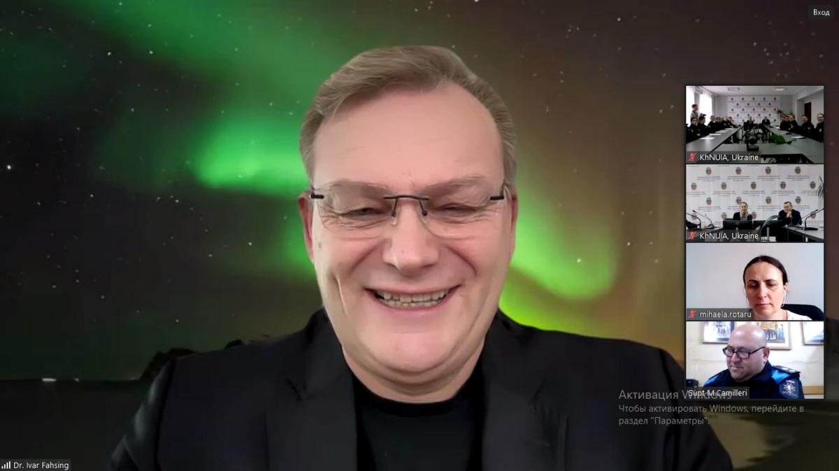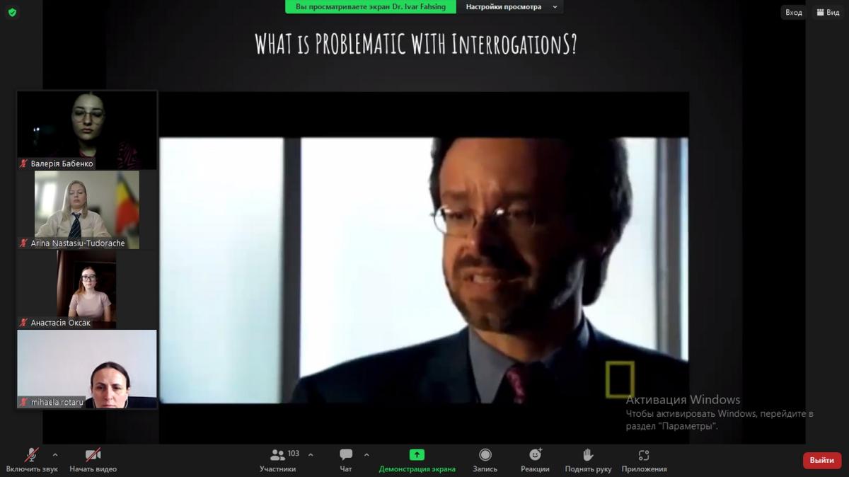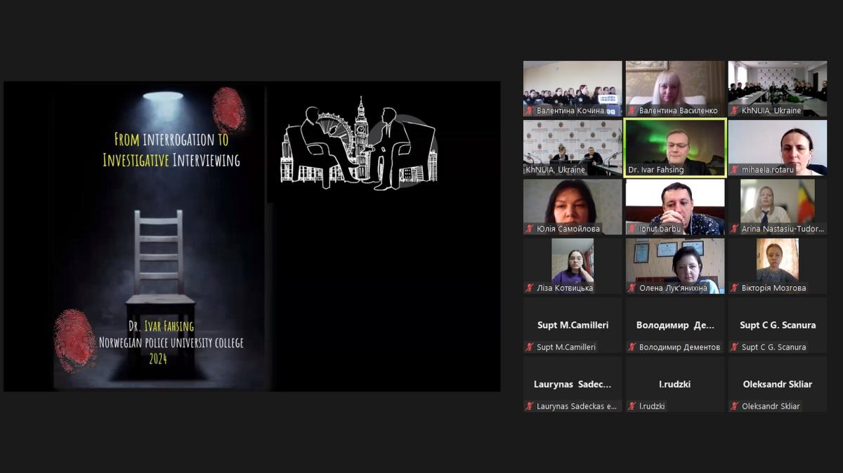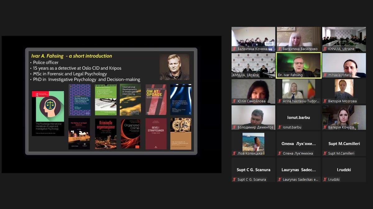 06 березня у контексті вивчення навчальних курсів «Культура юридичного мовлення» та «Іноземна мова» здобувачі 2 курсу спеціальності «Право», завідувач кафедри гуманітарних дисциплін Валентина Василенко та доцент цієї ж кафедри Юлія Самойлова стали учасниками онлайн-курсу «Від допиту до розслідування – зміна мислення». Спікером об`єднаного інтегрованого заходу став викладач Норвезького поліцейського університетського коледжу поліції Івар Андре Фахсінг.