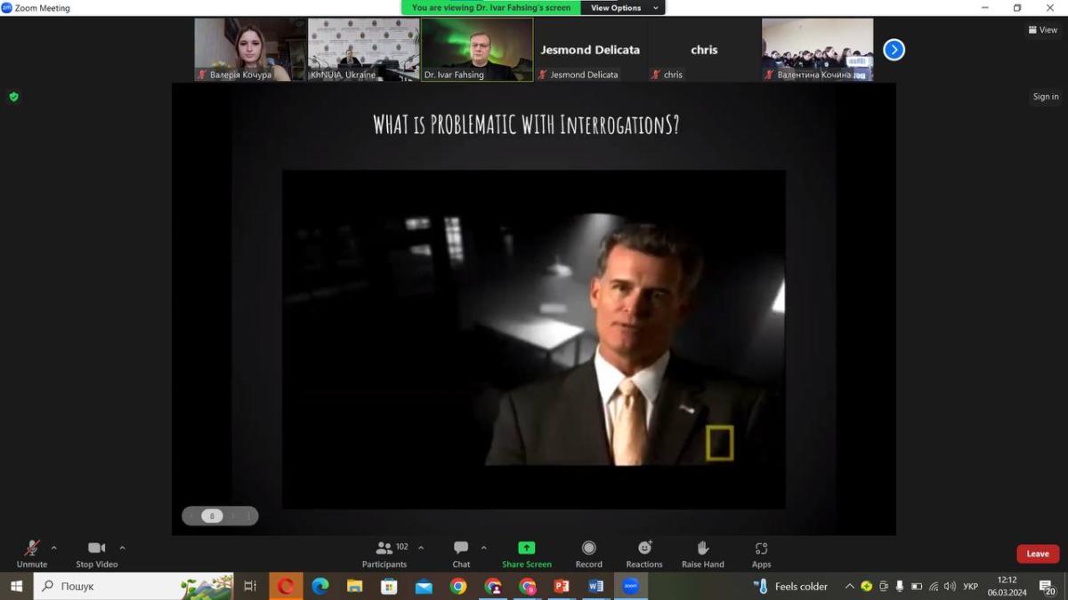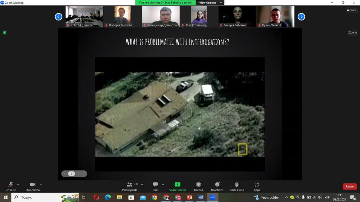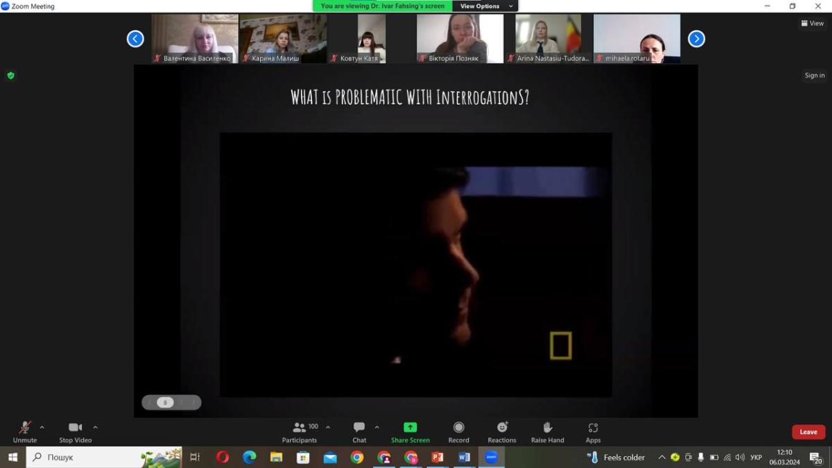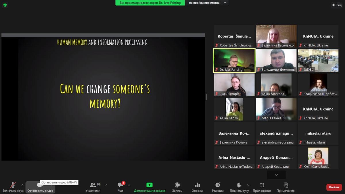 06 березня у контексті вивчення навчальних курсів «Культура юридичного мовлення» та «Іноземна мова» здобувачі 2 курсу спеціальності «Право», завідувач кафедри гуманітарних дисциплін Валентина Василенко та доцент цієї ж кафедри Юлія Самойлова стали учасниками онлайн-курсу «Від допиту до розслідування – зміна мислення». Спікером об`єднаного інтегрованого заходу став викладач Норвезького поліцейського університетського коледжу поліції Івар Андре Фахсінг.