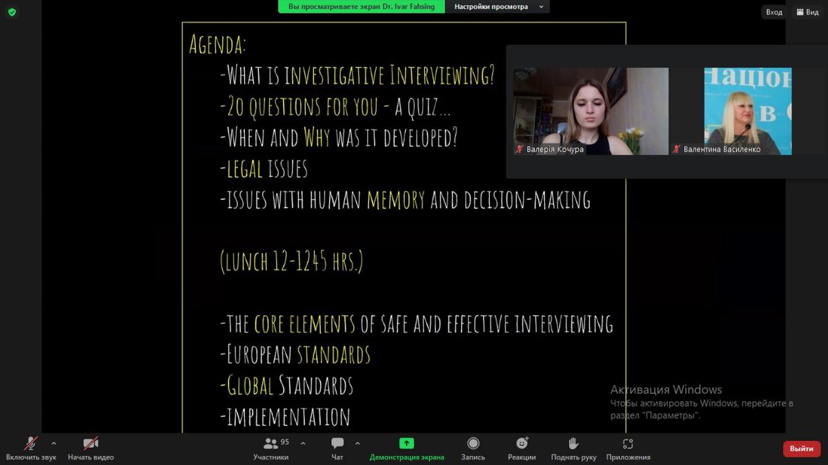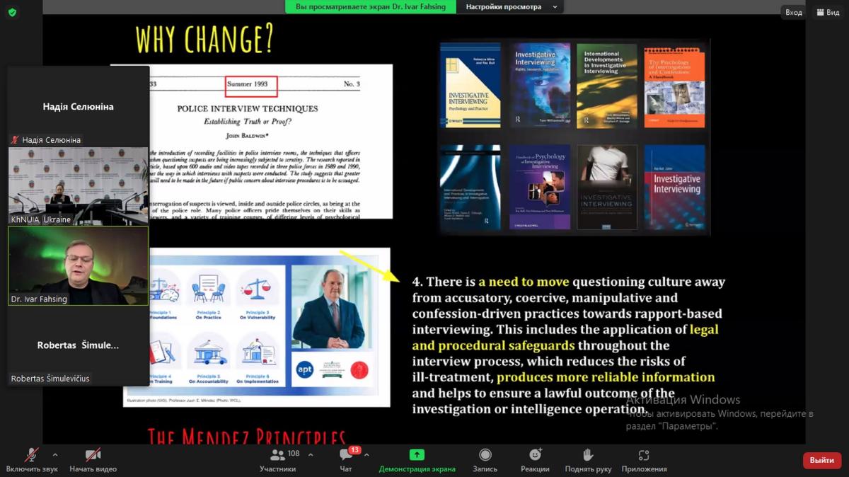 Професійне обґрунтування переваг запровадження методології опитування потерпілих, свідків і підозрюваних у вчиненні злочину на основі наукових досліджень, глобальних стандартів ефективного поліцейського інтерв’ю, включаючи Принципи Мендеса, та нещодавно затверджені принципи ООН з проведення слідчих опитувань та допитів стало доречним висвітленням теми заняття «Комунікативні вимоги до мовної поведінки під час інтерв`ювання. Техніка і тактика аргументування. Психологічні прийоми впливу на опитуваного» з навчальної дисципліни «Культура юридичного мовлення». Здобувачі також закріпили свої знання англійською з теми «Criminal justice»