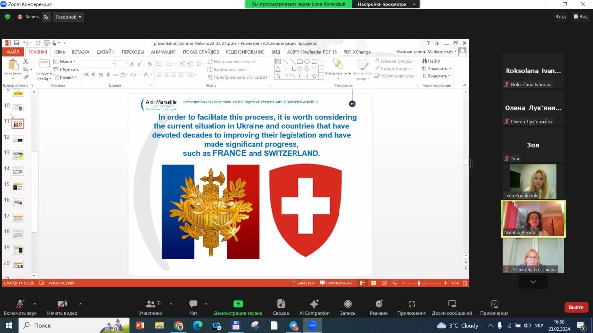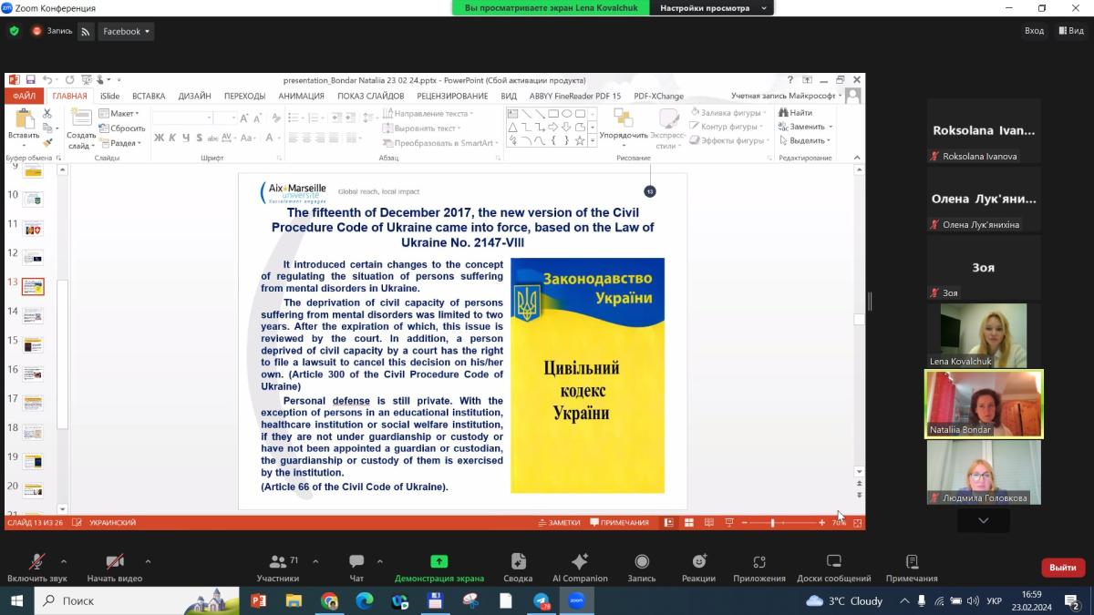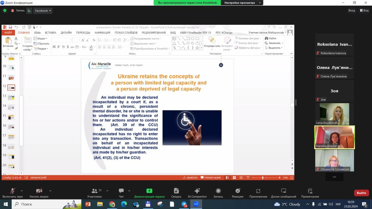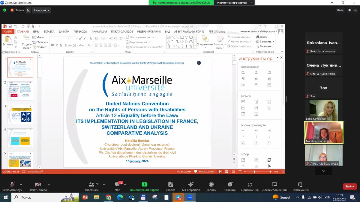 - Наталія Бондар – кандидат юридичних наук, зовнішній дослідник Університету Екс-Марсель, Аб-ан-Прованс United Nations Convention on the Rights of Persons with Disabilities Article 12 «Equality before the Law». ITS IMPLEMENTATION IN LEGISLATION IN FRANCE, SWITZERLAND AND UKRAINE COMPARATIVE ANALYSIS.