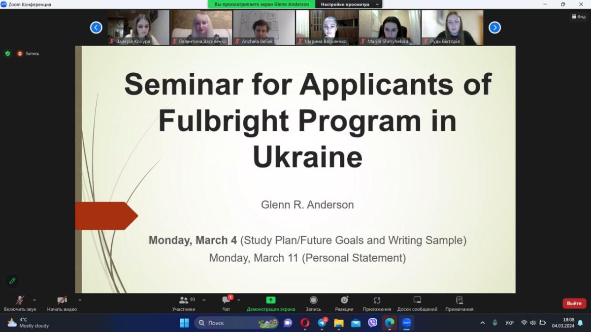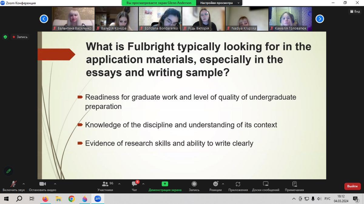 У межах діяльності Центру академічного письма Сумської філії ХНУВС здобувачі вищої освіти стали учасниками циклу семінарів та тренінгів із написання есе для програми Fulbright Graduate Student Program, а також відкритої інтерактивної лекції-презентації, організованих представництвом Інституту міжнародної освіти та Програми імені Фулбрайта в Україні, які проходили 06 та 11 березня 2024 року у онлайн-форматі.