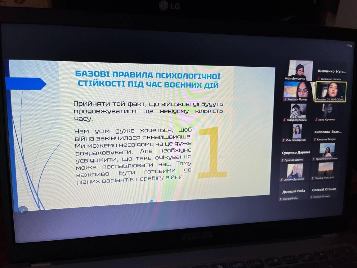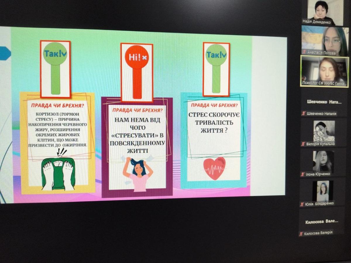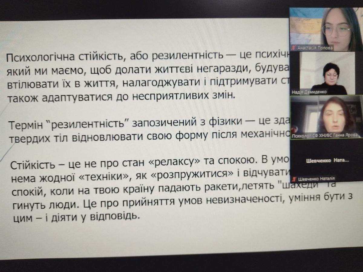 Психолог Ганна Ярова надала розширену характеристику базовим правилам психологічної стійкості, методам адаптації до несприятливих змін. Психолог зазначила, що важливу роль у подоланні стресу під час російсько - української війни грає особистісна мотивація, наполеглива праця над собою та позитивне мислення, відмова від перегляду зайвої негативної інформації в різноманітних засобах масової інформації тощо. Здобувачам вищої освіти було запропоновано пройти опитування стосовно внутрішньої стійкості та подолання сильного стресу. Також під час заняття Ганна Ярова ознайомила учасників зустрічі із системою психологічного забезпечення здобувачів вищої освіти Сумської філії, нагадала студентам координати, за якими вони можуть звертатися щодо психологічної допомоги.