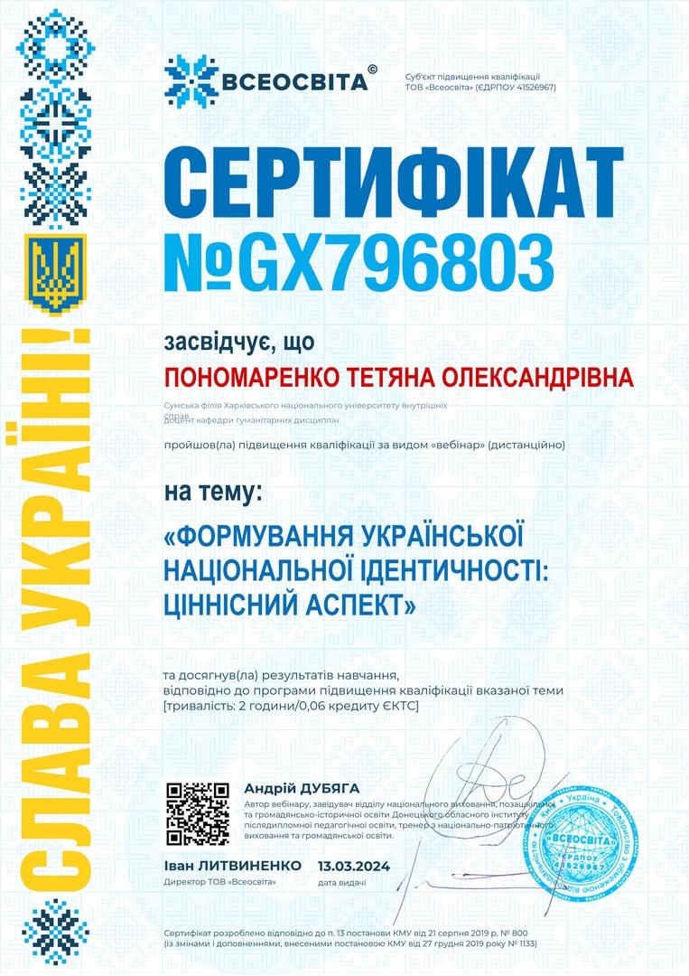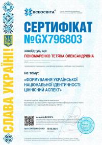 Отримані знання під час вебінару стануть у нагоді як здобувачам вищої освіти у розумінні сутності української національної ідентичності, сприятимуть формуванню цінностей патріотизму та громадянської ідентичності, так і доценту кафедри гуманітарних дисциплін в оволодінні сучасними методами формування української національної ідентичності, яка є одним з ключових елементів структури особистості громадянина-патріота, та будуть упроваджені під час викладання навчальних дисциплін «Соціологія» та «Філософія».