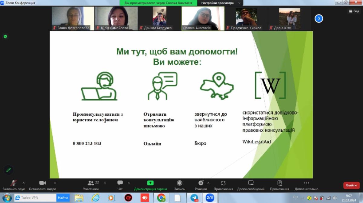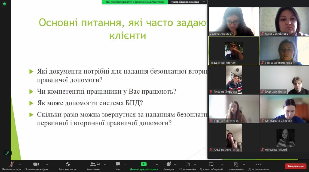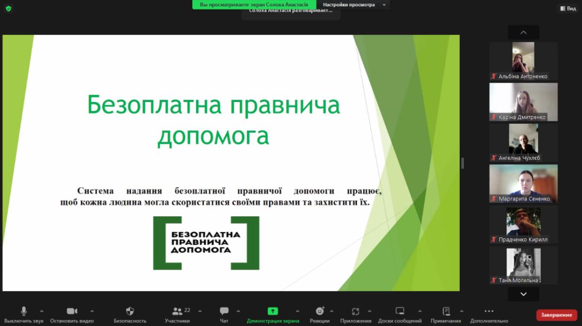 За ініціативи доцентів кафедри гуманітарних дисциплін Сумської філії Юлії Самойлової та Ганни Довгополової для здобувачів вищої освіти 1 курсу спеціальності «Право» було організовано та проведено бінарне заняття в рамках вивчення дисципліни «Іноземна мова» за участю головного юриста сектору Сумське бюро правничої допомоги Анастасії Солохи.