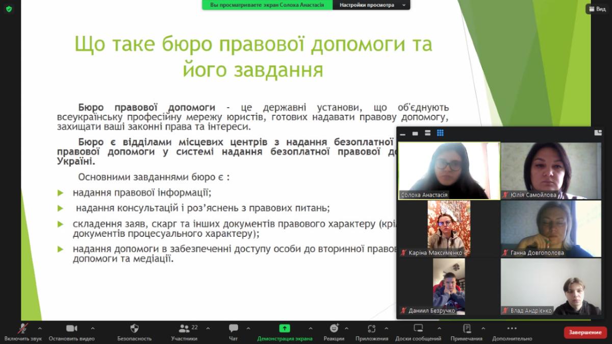 Запрошений фахівець обговорила зі здобувачами поняття безоплатної правової допомоги, пояснила особливості роботи саме вищевказаного сектору, його основні завдання. Окрім того, розглянули види правничої допомоги, хто має право на первинну і вторинну правничу допомогу. В ході бесіди у здобувачів виникало безліч питань, на які вони отримали вичерпні відповіді від спеціаліста.