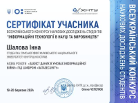 Здобувачка 1 курсу магістратури за спеціальністю 262 «Правоохоронна діяльність» Інна Шалова (під керівництвом наукового керівника Виганяйло Світлани Миколаївни) взяла участь у Всеукраїнському конкурсі наукових досліджень студентів «Інформаційні технології в науці та виробництві» Херсонського національного технічного університету (м. Хмельницький) на тему «DataSecurity Захист даних в умовах інформаційної війни». В даній роботі досліджувалась та популяризувалась технологія захисту даних WAF для використання серед населення, що спрямовано на запобігання та протидію шахрайським діям в мережах. Конкурсантка популяризувала технологію та пропонувала використовувати технологію для протидії зловживанням у сфері послуг в мережі.