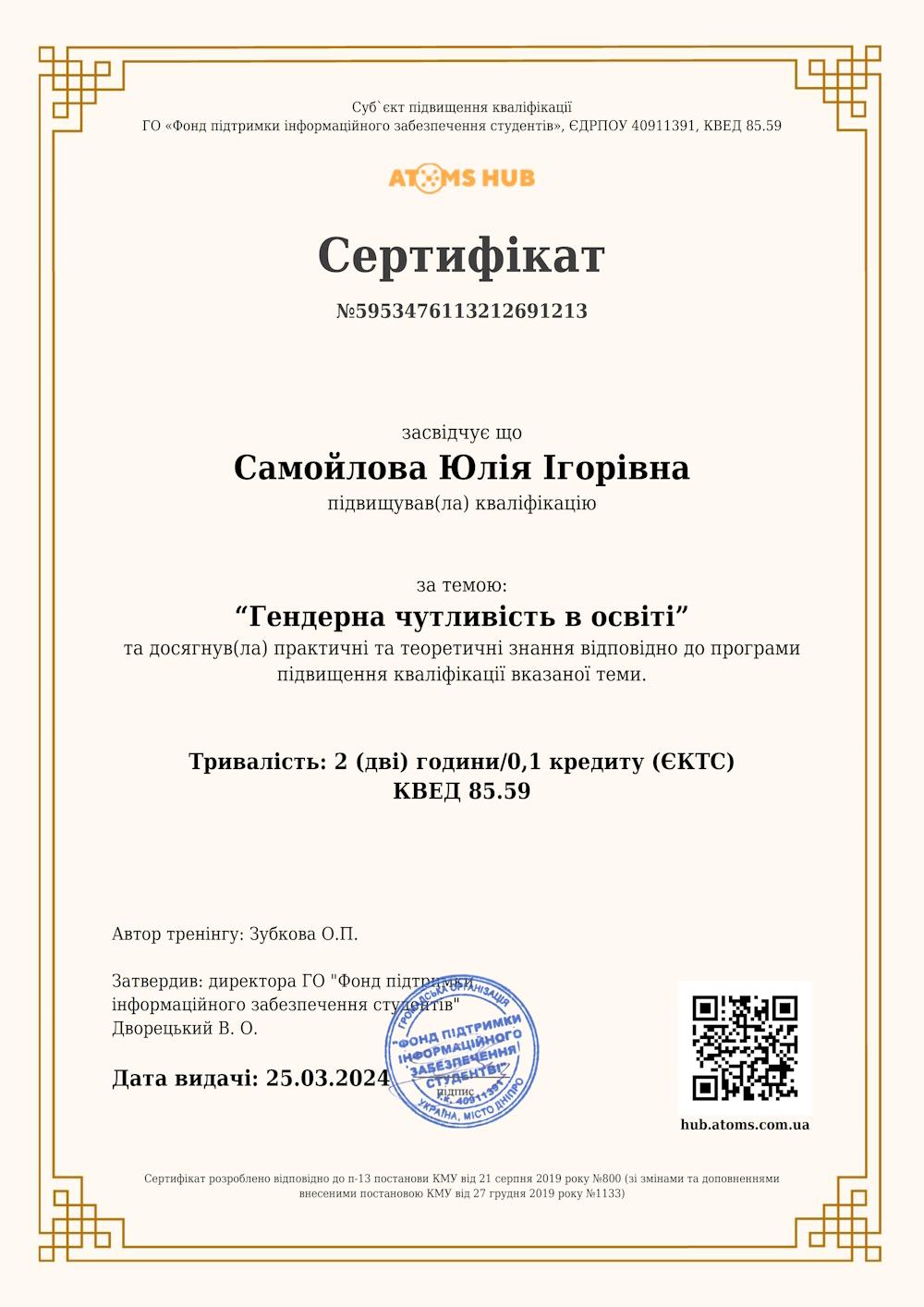 Доцент кафедри гуманітарних дисциплін Сумської філії ХНУВС Юлія Самойлова успішно завершила програму підвищення кваліфікації (участь у вебінарі) «Гендерна чутливість в освіті». Метою даного вебінару було ознайомлення з поняттям «ґендерна чутливість» для створення в освітньому закладі ґендерно чутливого освітнього простору, тобто простору без ґендерних стереотипів і дискримінацій, у якому люди здатні й готові виявляти, помічати, аналізувати та реагувати на все, пов’язане з ґендерною нерівністю та ґендерними стереотипами.