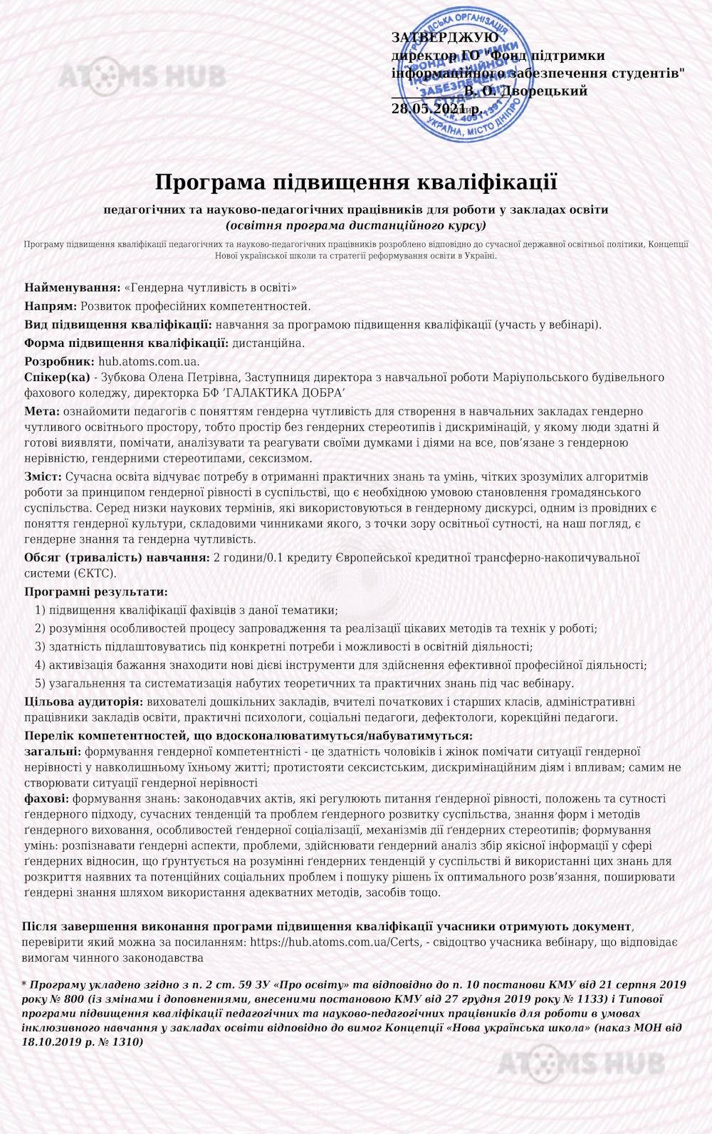 Під час вебінару всі учасники мали змогу ознайомитися з основними законодавчими актами, які регулюють питання ґендерної рівності, положень та сутності ґендерного підходу, сучасними тенденціями та проблемами ґендерного розвитку суспільства, формами і методами ґендерного виховання. Окрім того, всі учасники набули вміння розпізнавати ґендерні аспекти та проблеми в освітній сфері, а також дізналися як знаходити рішення для їх оптимального розв’язання.