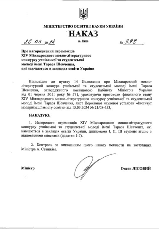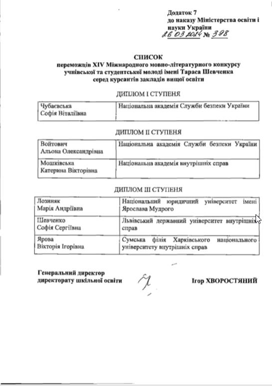 Відповідно до наказу Міністерства освіти і науки України від 26 березня 2024 року № 398 курсанта 2 курсу Сумської філії Харківського національного університету внутрішніх справ Вікторію ЯРОВУ (керівник – завідувач кафедри гуманітарних дисциплін Валентина ВАСИЛЕНКО) відзначено дипломом третього ступеня за перемогу у XIV Міжнародному мовно-літературному конкурсі учнівської та студентської молоді імені Тараса Шевченка серед курсантів закладів вищої освіти.