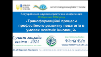 28 березня 2024 року відбулася Всеукраїнська науково-практична конференція «Трансформаційні процеси професійного розвитку педагогів в умовах освітніх інновацій», організована та проведена Державною науковою установою «Інститут модернізації змісту освіти» в рамках П’ятнадцятої міжнародної виставки «Сучасні заклади освіти – 2024».
