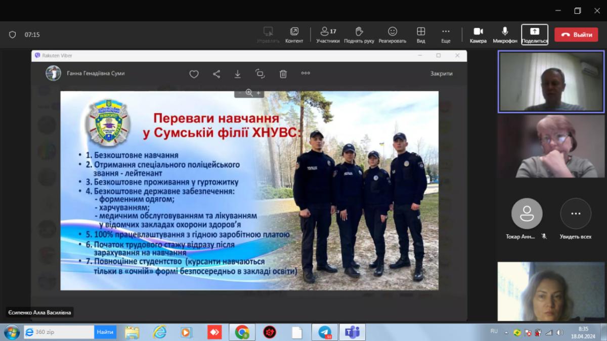 Доцент кафедри гуманітарних дисциплін Ганна Довгополова та профідний фахівець філії Валерій Кудрявцев познайомили майбутніх абітурієнтів із перевагами навчання в Сумській філії ХНУВС, серед яких, зокрема, залучення до освітнього процесу юристів-практиків та юридичних установ міста, можливість обміну досвідом та спілкування зі студентами-правознавцями Європейської асоціації студентів права, яскраве та активне студентське життя.
