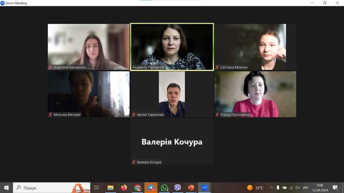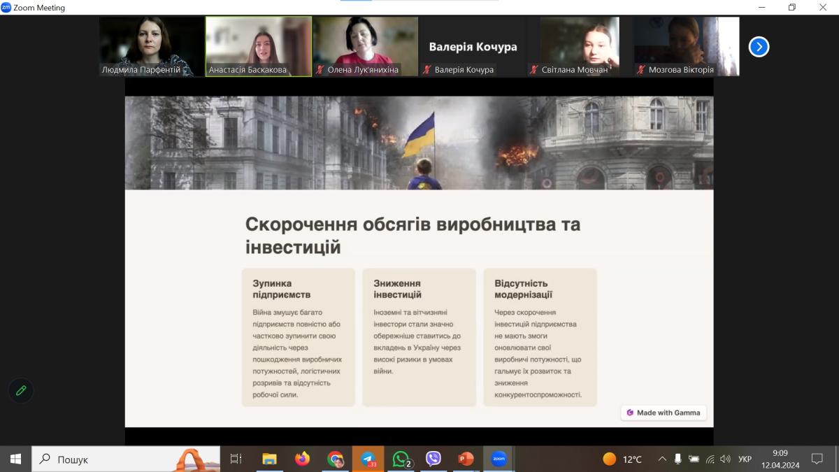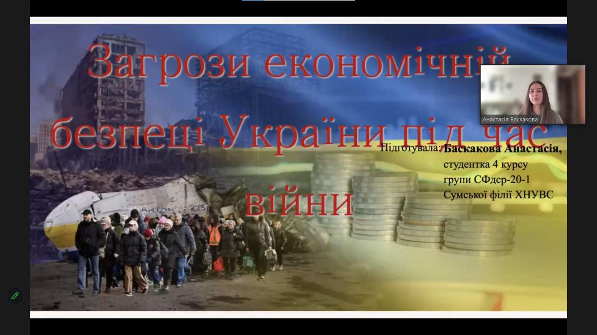 На початку засідання з вступним словом до студентів-гуртківців звернулися керівниця гуртка Людмила Анатоліївна Парфентій та завідувачка кафедри соціально-економічних дисциплін Олена Анатоліївна Лук’янихіна. Після цього з доповіддю на тему «Загрози економічній безпеці України під час війни» виступила студентка 4 курсу спеціальності 081 Право Баскакова Анастасія (науковий керівник - канд. екон. наук Парфентій Людмила Анатоліївна).