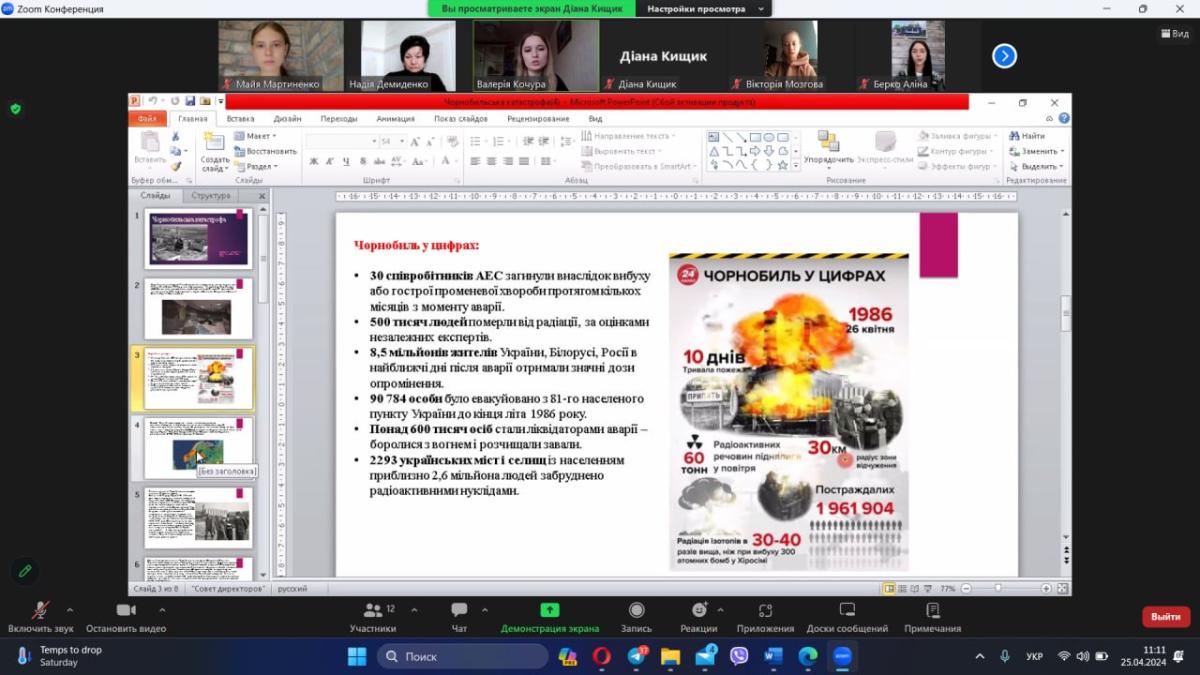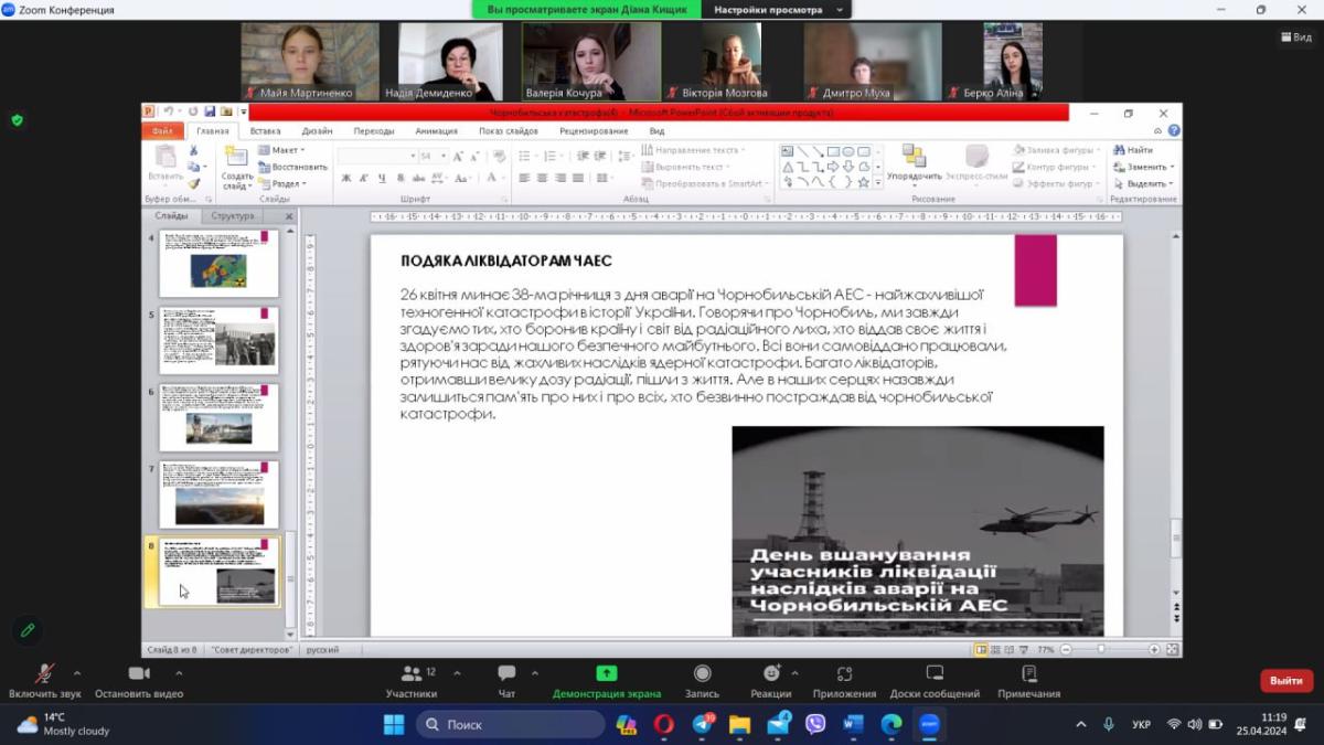 Для студентів 2 курсу спеціальності Право була проведена кураторська година, присвячена трагічній події – найбільшій техногенній катастрофі ХХ століття. У вступному слові професор кафедри гуманітарних дисциплін, куратор груп СФ дср-22-1, СФдср-22-2 Надія Демиденко зазначила, що тридцять вісім років тому, а саме 26 квітня 1986 року, на Чорнобильській атомній станції спалахнув реактор, де знаходились майже 200 тон урану. Радіоактивні речовини вирвались назовні, отруюючи все навколо.