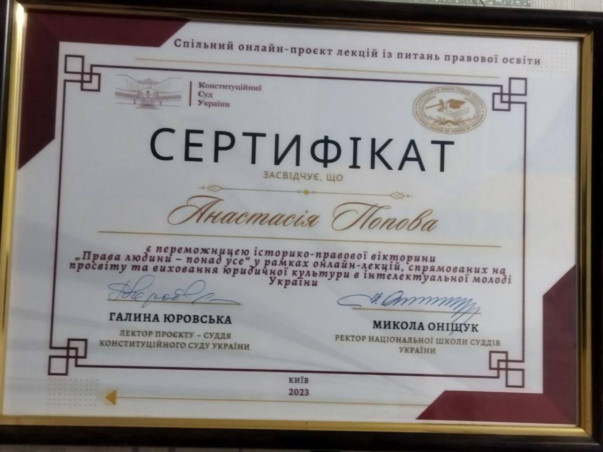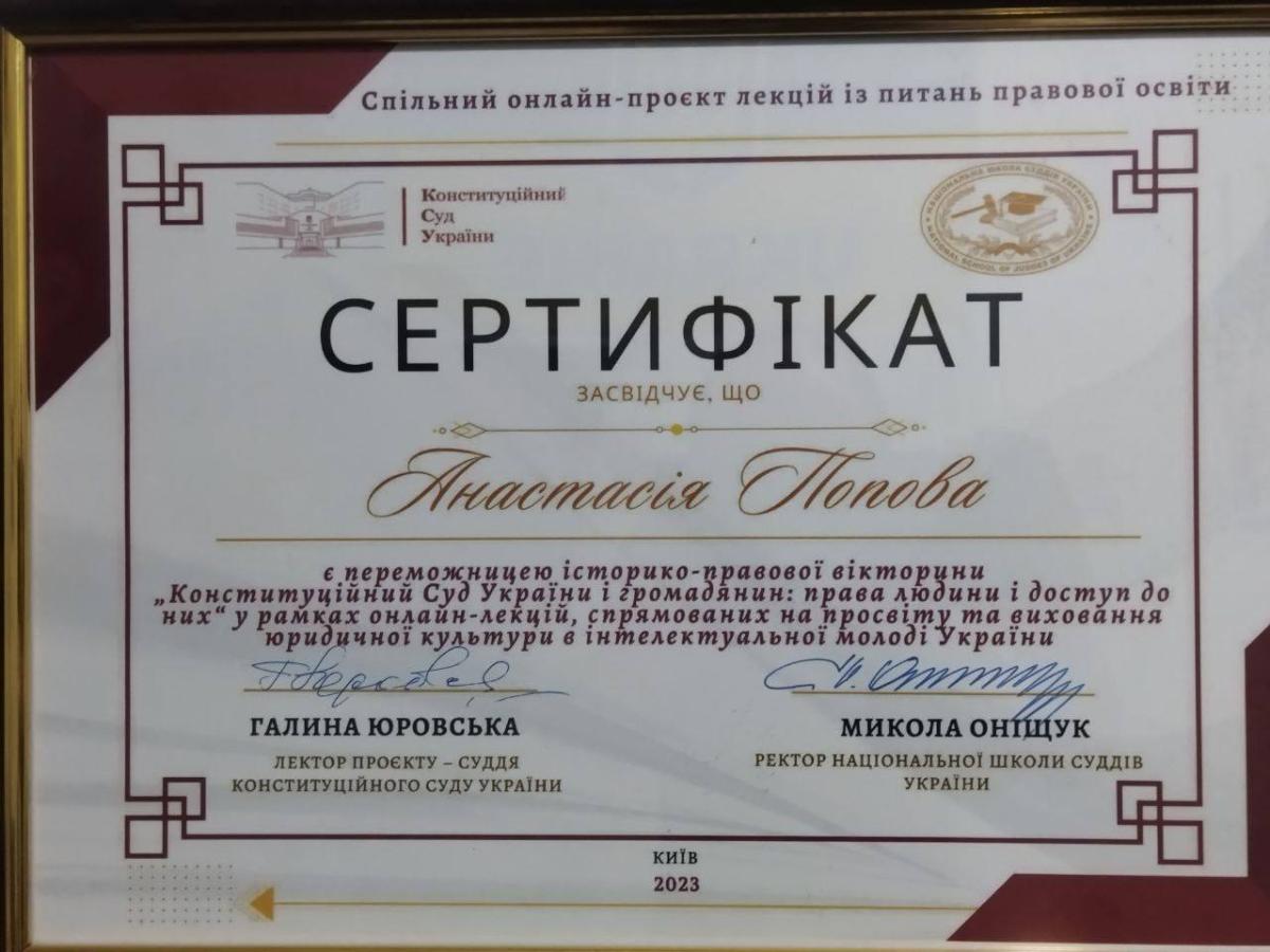 Анастасія займає активну позицію у громадському житті закладу вищої освіти: староста групи, член школи наукового лідерства, учасниця курсу Модуля Жана Моне «Цифрова трансформація прав: досвід ЄС»; курсу від AICE Project Agents 2024 «Академічна доброчесність в європейському освітньому і науковому просторах: багатовимірна імерсивна модель». Наша першокурсниця - переможниця історико-правових вікторин від Конституційного Суду України та лауреат конкурсу наукових робіт серед здобувачів вищої освіти ХНУВС.