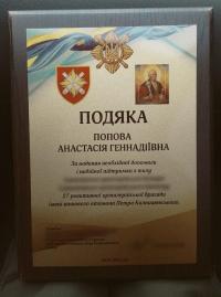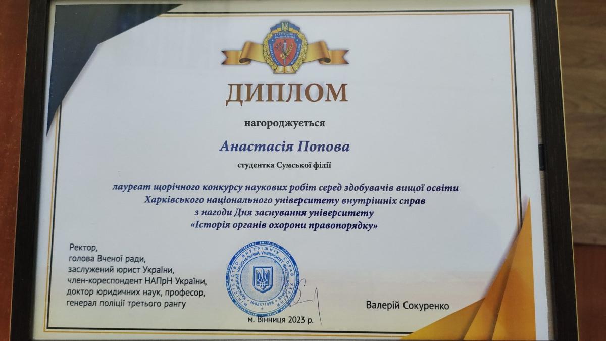 Студентку першого курсу Сумської філії Харківського національного університету внутрішніх справ Анастасію Попову обрано до складу Студентської ради при Сумській обласній державній адміністрації.