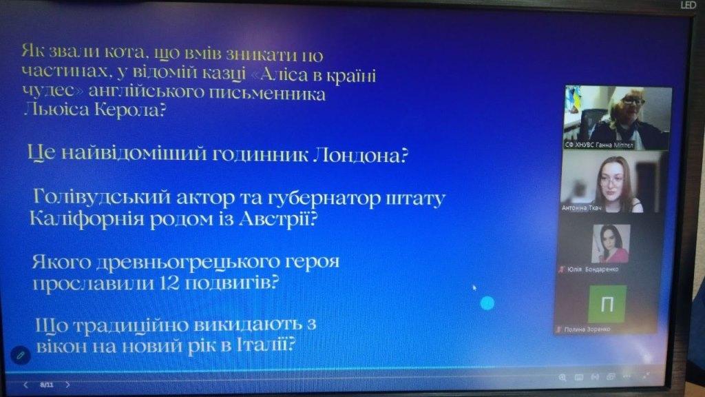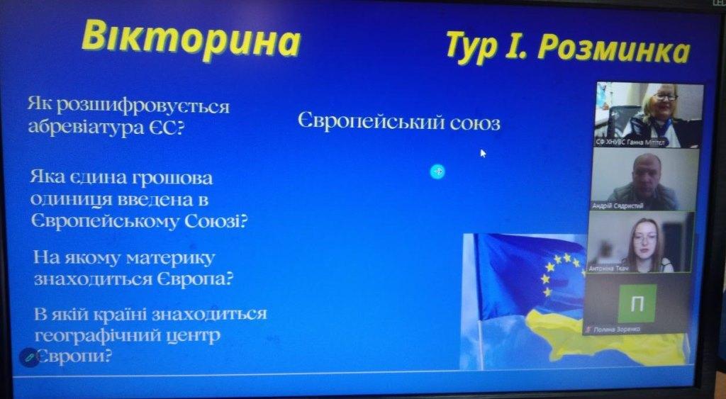 Після презентації студенти взяли участь у вікторині, яку підготувала студентка третього курсу за спеціальністю «Право» Антоніна Ткач. Цікаві питання допомогли учасникам вікторини поглибити свої знання про Європу.