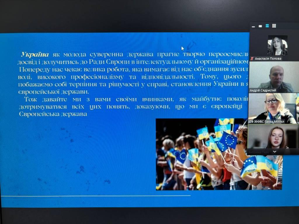 Для студентів першого курсу Сумської філії Харківського національного університету внутрішніх справ за спеціальністю «Правоохоронна діяльність» була організована та проведена провідним фахівцем відділення кадрового забезпечення Ганною Мітітєл виховна година до Дня Європи, яка спрямована на підвищення європейської свідомості та сприяння розвитку європейської ідентичності серед молоді.