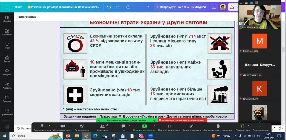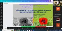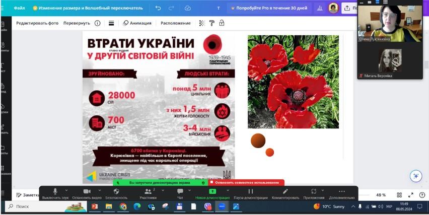 В межах бесіди згадали інформаційні факти про гуманітарні та економічні наслідки тієї війни для нашої країни, участь українців у військових діях як у складі червоної армії, так і армій союзників, масштабні втрати серед цивільного населення та військових, обумовлені діями як гітлерівців, так і радянського режиму, значні втрати людських ресурсів та економічного потенціалу України, котрий потім потрібно було відновити українцям, котрі вижили і вистояли після 4 років надскладних випробувань.