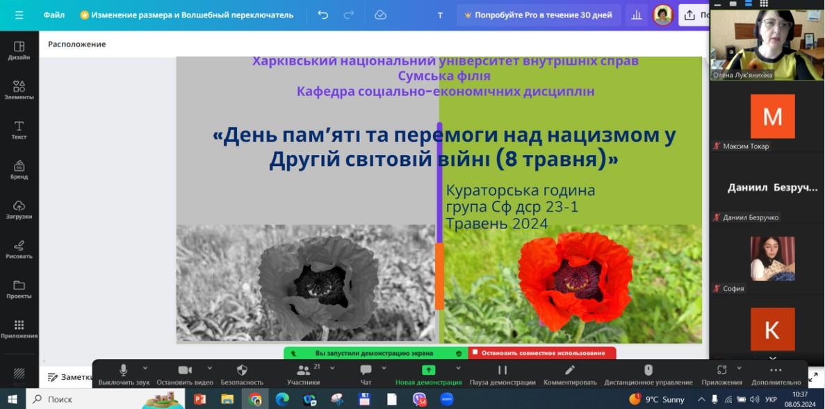8 травня 2024 року для студентів групи Сфдср23-1 спеціальності Право куратором завідувачкою кафедри соціально-економічних дисциплін Сумської філії Харківського національного університету внутрішніх справ, кандидатом економічних наук, доценткою Оленою Лук’янихіною проведено кураторську бесіду до Дня пам’яті та перемоги над нацизмом у Другій світовій війні 1939-1945 років.