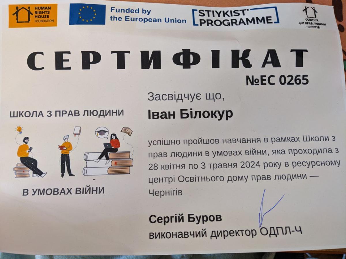 Іван отримав Сертифікат, який засвідчує, що він успішно пройшов навчання у рамках Школи з прав людини в умовах війни, що відбулася у ресурсному центрі Освітнього дому прав людини.
