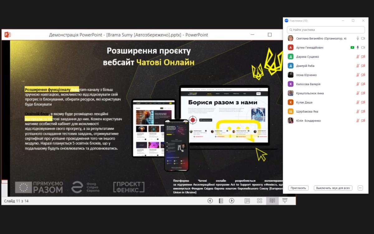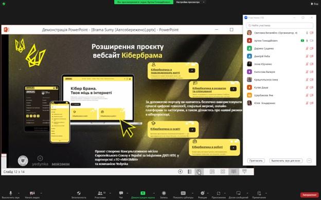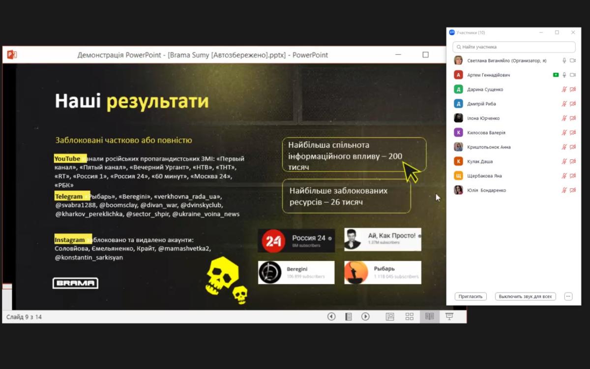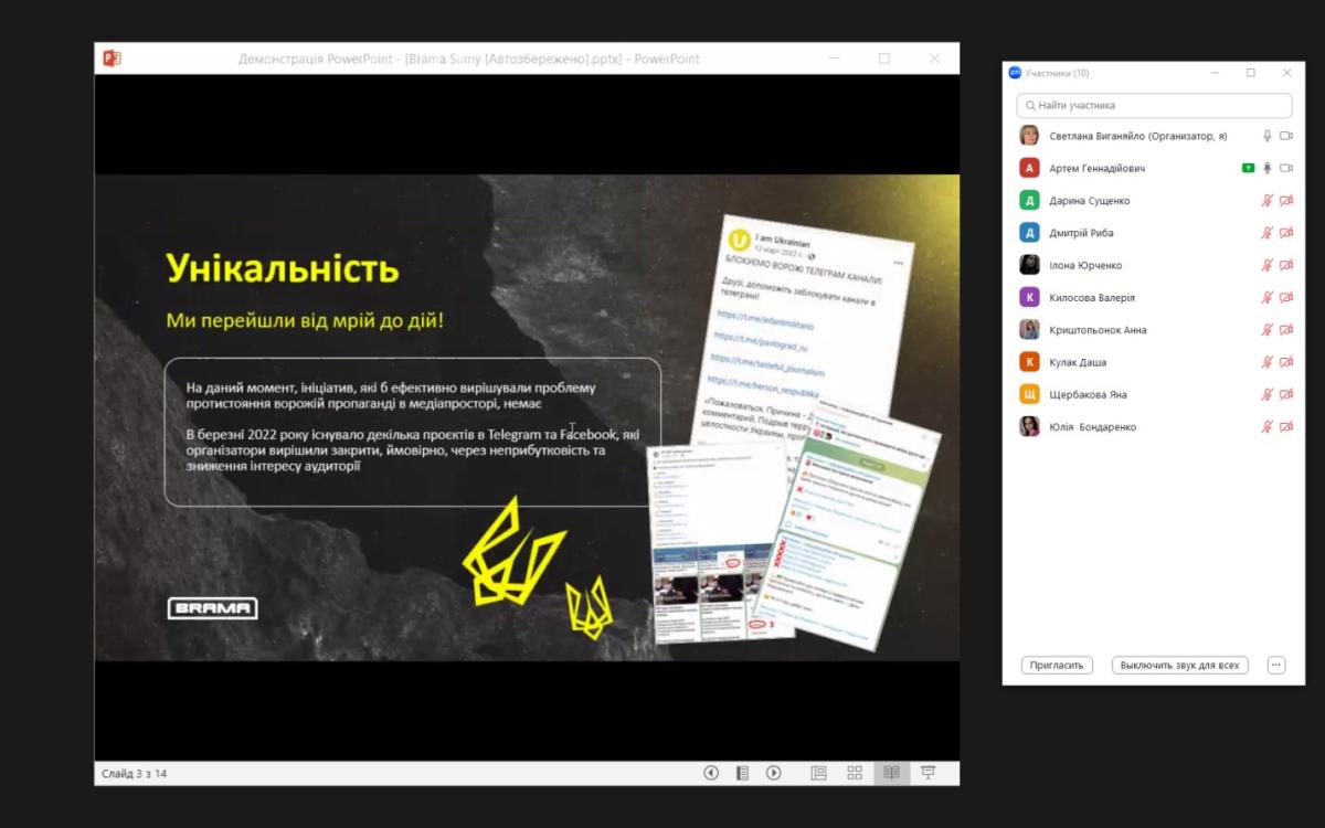 Під час заняття обговорили питання протидії кіберзлочинам в нашій області. Здобувачам було представлено проект BRAMA, основною місією якого є об’єднання зусиль громадян, приватного та державного секторів у протидії дезінформації та незаконному контенту в інформаційному просторі.