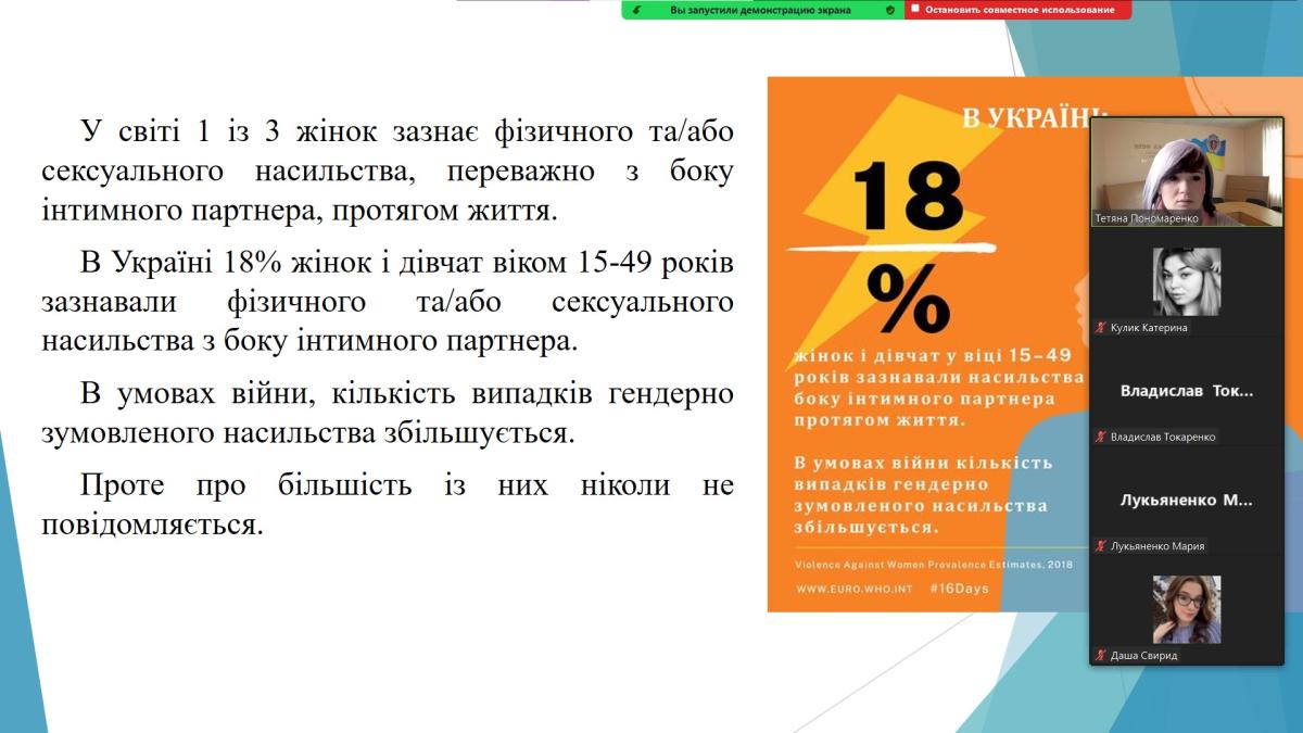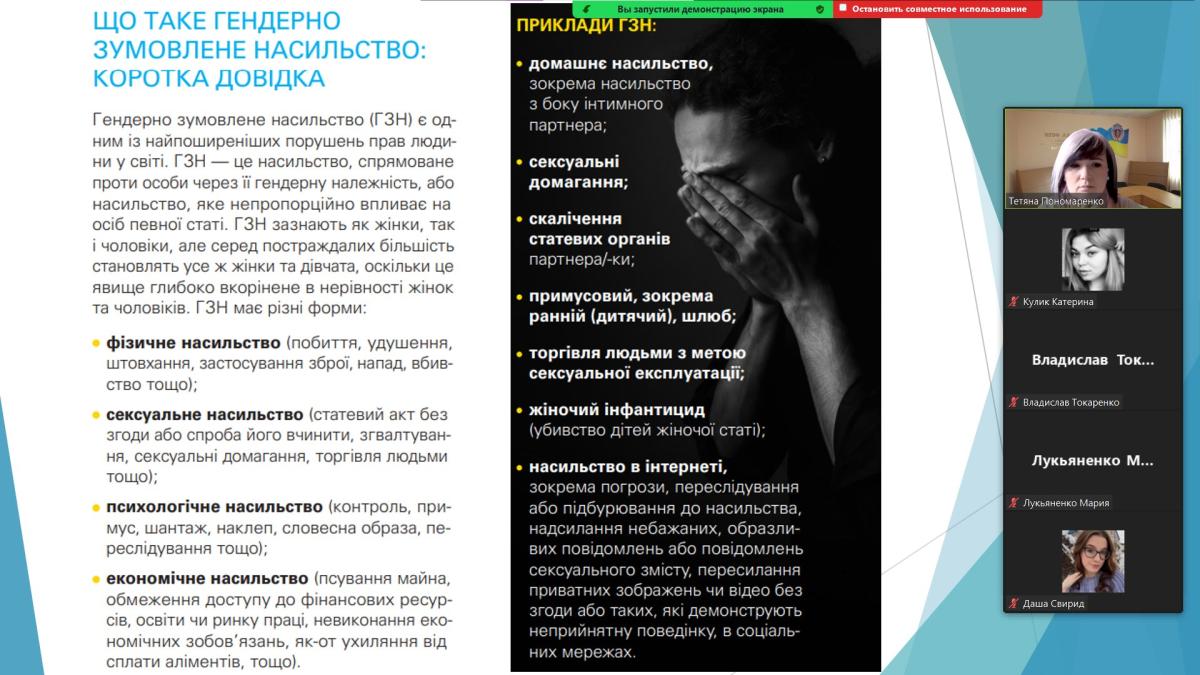 Відповідно до плану куратора доцентом кафедри гуманітарних дисциплін Сумської філії ХНУВС Тетяною Пономаренко проведено інформаційно-просвітницький захід зі здобувачами вищої освіти групи СФ-ПДдср-21-1 на тему «Гендерно зумовлене насильство – це не ОК», в ході якого було розглянуто сутність та особливості, причини й наслідки гендерно зумовленого насильства; питання підтримки людей, які його пережили. Увагу здобувачів було зосереджено на світових та українських показниках зафіксованих злочинів, а також відповідальності за скоєне. Порівняння статистик і показників сприяло жвавому обговоренню проблеми та пошуку шляхів її вирішення та попередження.