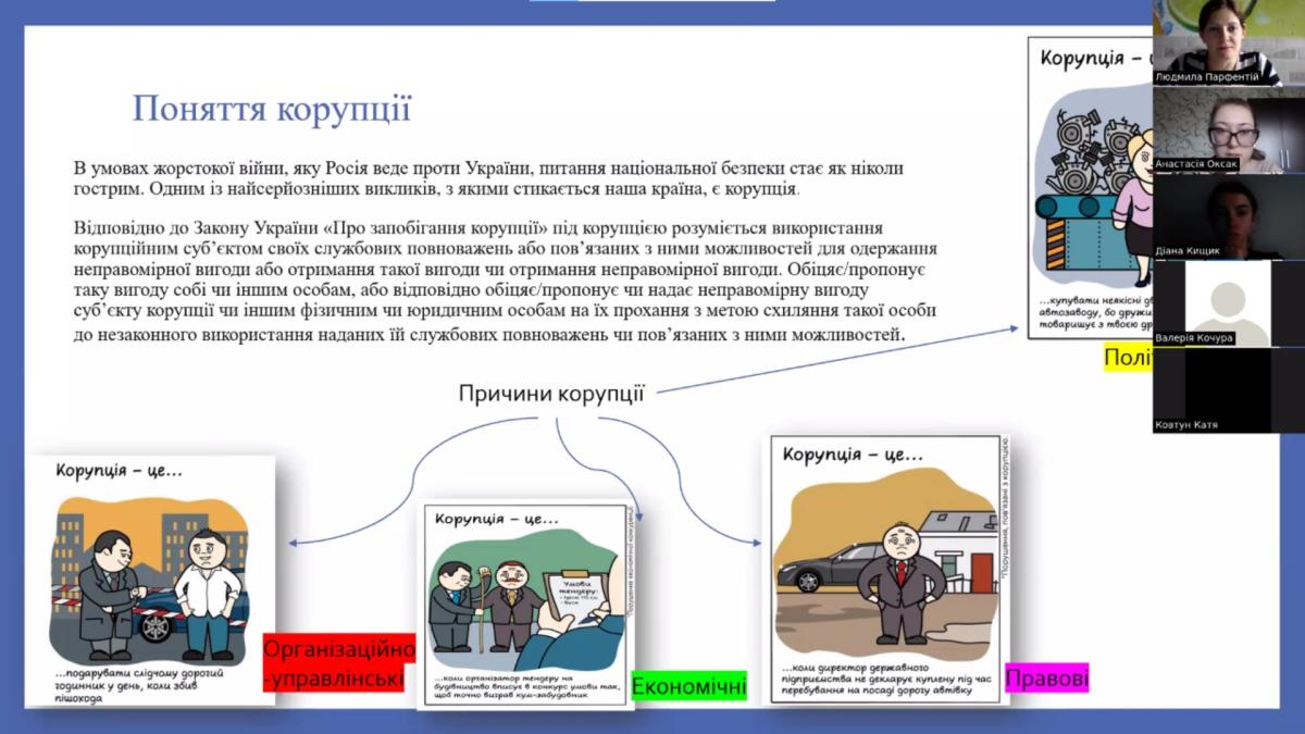 На початку засідання з вступним словом до студентів-гуртківців звернулася керівниця гуртка Людмила Анатоліївна Парфентій. Після цього з доповіддю на тему «Корупційна злочинність як загроза національній безпеці України під час війни» виступила студентка 2 курсу спеціальності 081 Право Оксак Анастасія (науковий керівник - канд. екон. наук Парфентій Людмила Анатоліївна).