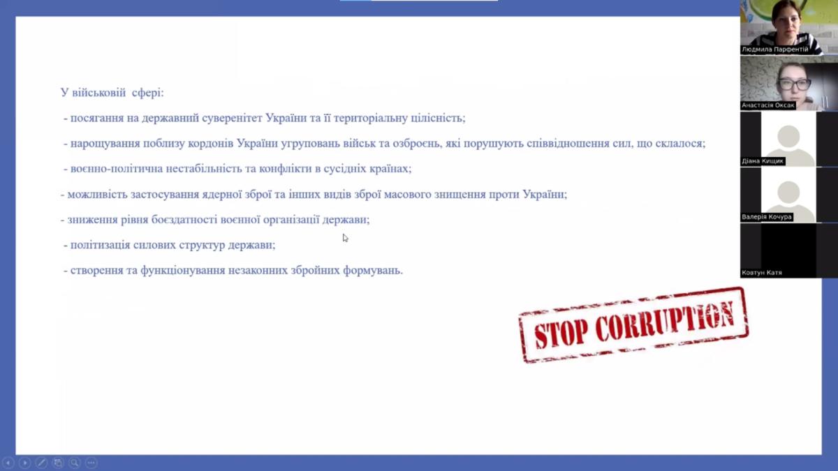 Тема доповіді на сьогоднішній день є дуже актуальною, а сама доповідь, презентована студенткою, виявилася змістовною та інформативною, оскільки було розглянуто корупційні злочини у військовій та безпековій сфері, а також проаналізовано негативні наслідки корупційної злочинності.