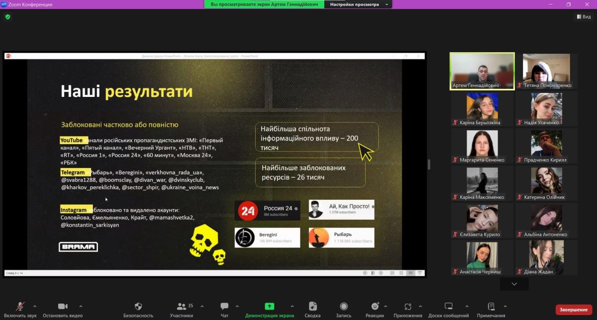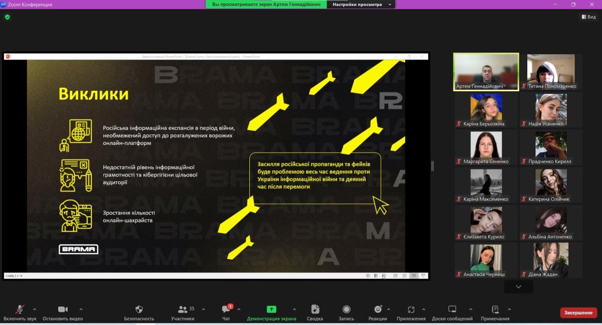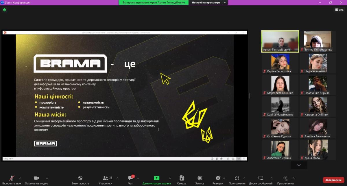 Здобувачі вищої освіти взяли активну участь в інтерактиві під час обговорення тем, що були актуалізовані Артемом Бухтіаровим, зокрема й тих, що стосувалися фейкових новин, шахрайства, булінгу й кібербулінгу, фішингу тощо. Також здобувачам були надані корисні посилання, що допоможуть майбутнім юристам бути медіаграмотними та здобувати вищу освіту в інформаційно безпечному середовищі.
