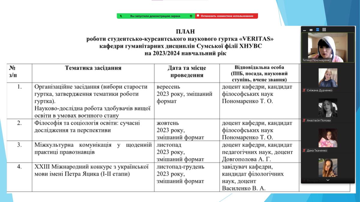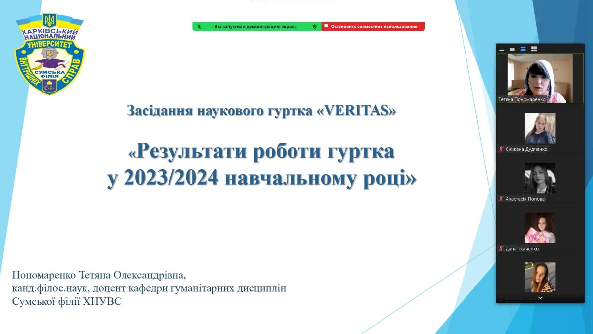 29 травня 2024 року відбулося підсумкове засідання наукового гуртка «Veritas» кафедри гуманітарних дисциплін Сумської філії ХНУВС, під час якого науковий керівник гуртка, кандидат філософських наук Тетяна Пономаренко зосередила увагу на основних результатах роботи гуртка у 2023-2024 навчальному році, наголосивши на досягненнях і перемогах гуртківців.