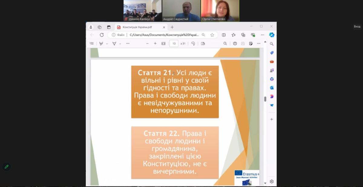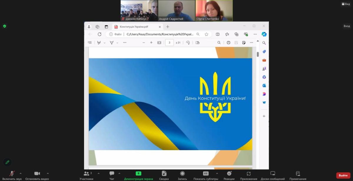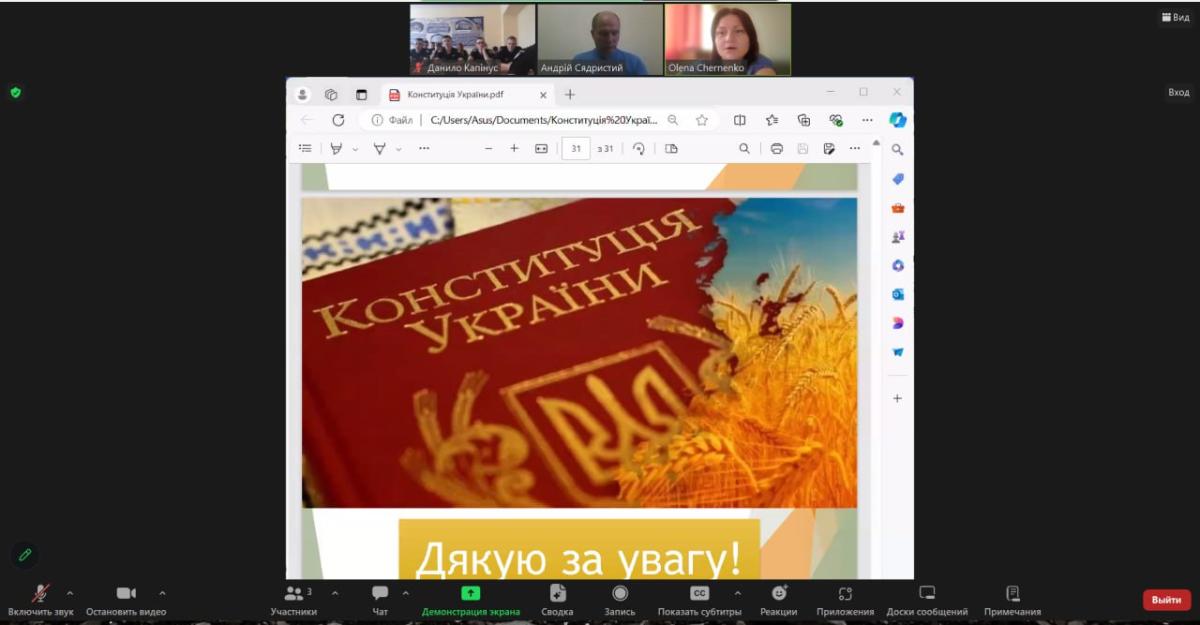 Старший викладач кафедри юридичних дисциплін Сумської філії ХНУВС Андрій Сядристий разом з доценткою кафедри міжнародних відносин, міжнародної інформації та безпеки Харківського національного університету імені В.Н. Каразіна, кандидатом юридичних наук Оленою Черненко провели кураторську годину з групою СФ-101, присвячену Дню Конституції України. На початку зустрічі Андрій Сядристий звернув увагу на історію створення Конституції України, на ряд конституційних законопроектів, Конституційного Договору, які передували її прийняттю, на так звану «конституційну ніч» та деякі цікаві факти щодо її прийняття. Олена Черненко акцентувала увагу на короткому аналізі Основного Закону України, його змісті, вказуючи, що міжнародне співтовариство схвалило Конституцію України, назвавши її однією з найдемократичніших у світі, яка базується в своїй основі на положеннях Загальної декларації прав людини, Міжнародному пакті про громадянські і політичні права, Міжнародному пакті про економічні, соціальні та культурні права.