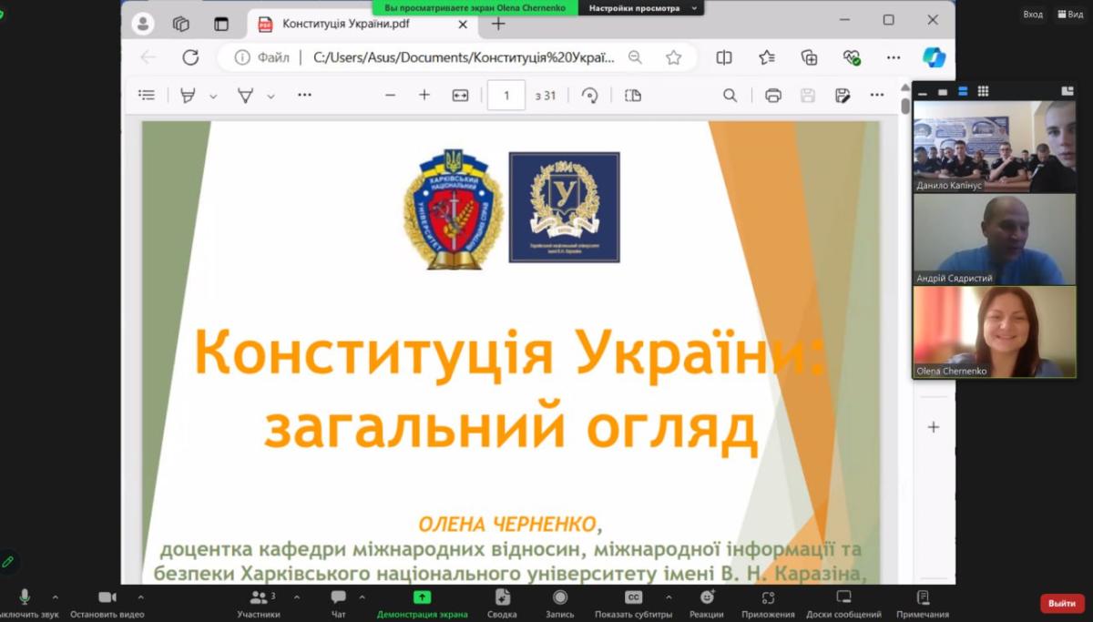 Можна вказати, що протягом навчального року в рамках проведень кураторських годин було проведено ряд заходів, які були присвячені більш глибокому вивченню положень Основного Закону під час «Години Конституції України». Неодноразово до таких заходів долучалася завідуюча сектором муніципального права та місцевого самоврядування Науково-дослідного інституту державного будівництва та місцевого самоврядування, доцент кафедри конституційного і муніципального права юридичного факультету ХНУ імені В.Н. Каразіна, кандидат юридичних наук, старший дослідник Лілія Гришко. Під час таких зустрічей розглядалися питання змісту конституційних прав і свобод відповідно до Розділу ІІ Конституції України, статті 1 з детальним аналізом, питання щодо гідності в рамках статті 3 та ряд інших актуальних питань. Участь такого рівня фахівців в галузі конституційного права лише підсилює потяг курсантів до знань, більш детального опанування норм Конституції України та її належному застосування. Варто зазначити, що дана робота в цьому напрямку не припиняється і курсантів чекають ще більш цікавіші кураторські години в рамках детального вивчення положень Конституції України як Основного Закону нашої держави, визначенні її ролі в держатворенні та правотворчій діяльності в Україні.