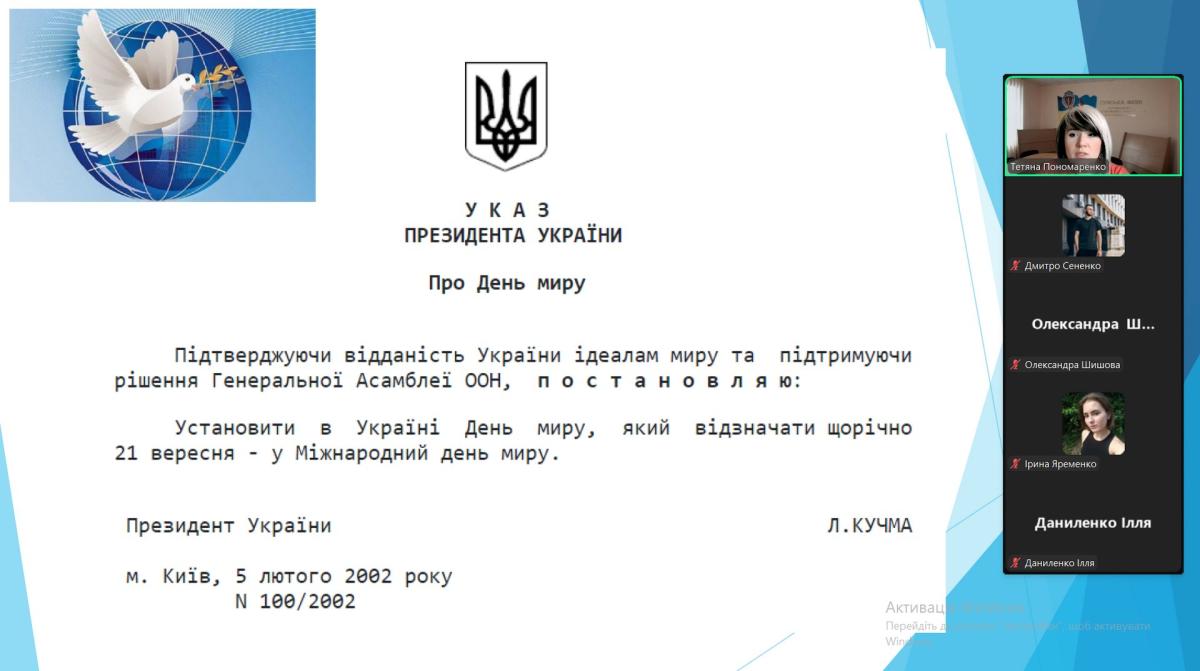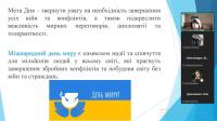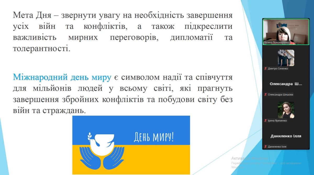 Міжнародний день миру відзначають у всьому світі з 1981 року за ініціативи Генеральної Асамблеї ООН як день всесвітньої відмови від насильства та вогню. В Україні День миру встановлений Указом Президента від 05.02.2002 № 100/2002 «День миру» і відзначається щорічно 21 вересня – Міжнародний день миру.