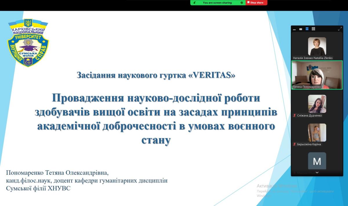 Відповідно до затвердженого плану 30 вересня 2024 року відбулося перше у 2024/2025 навчальному році засідання наукового гуртка кафедри гуманітарних дисциплін «Veritas» на тему «Провадження науково-дослідної роботи здобувачів вищої освіти на засадах принципів академічної доброчесності в умовах воєнного стану».