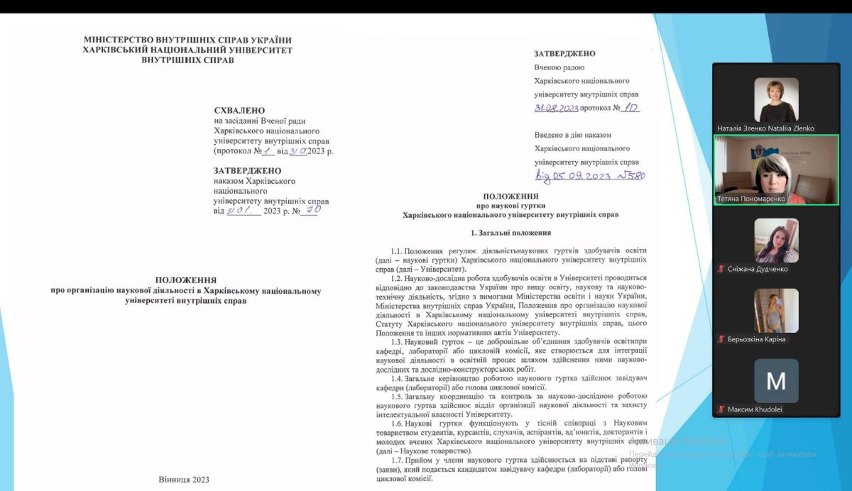 Під час окреслення основних питань теми засідання керівник гуртка, доцент кафедри гуманітарних дисциплін Сумської філії ХНУВС Тетяна Пономаренко наголосила на особливостях здійснення науково-дослідної роботи здобувачів закладів вищої освіти зі специфічними умовами навчання, а також нормативних документах, що регламентують її провадження в університеті.