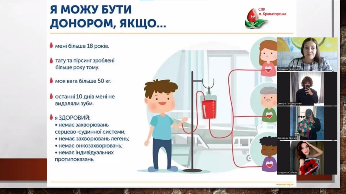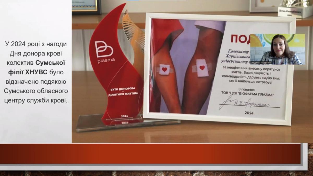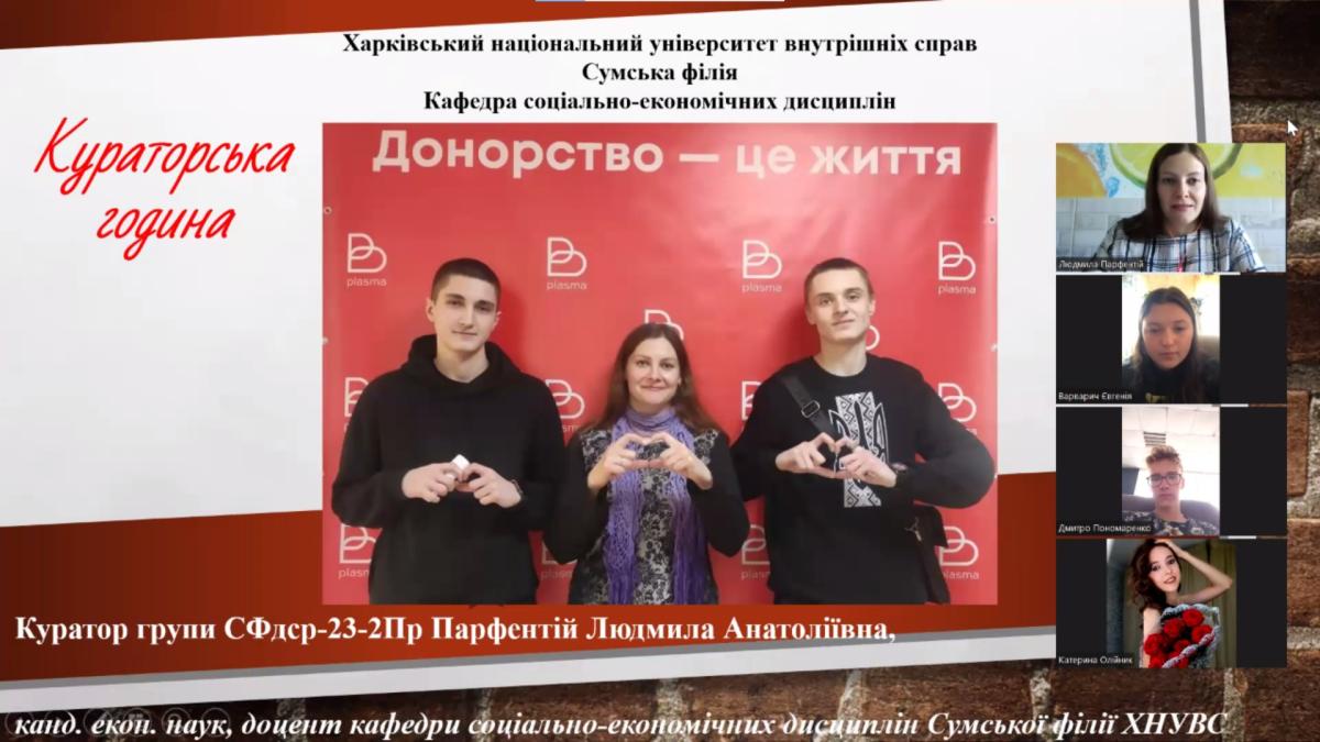 З огляду на важливість і необхідність донорства доценткою кафедри соціально-економічних дисциплін Сумської філії ХНУВС Людмилою Парфентій було проведено кураторську годину «Донорство – це життя» для студентів другого курсу спеціальності «Право» групи СФдср-23-2Пр. Було обговорено суспільну важливість донорства крові, ознайомлено здобувачів з інформацією про те, хто може бути донором, як підготуватися до донорства та відновитися після здачі крові. Також кураторка закликала студентів долучатися до донорського руху Сумської філії ХНУВС.