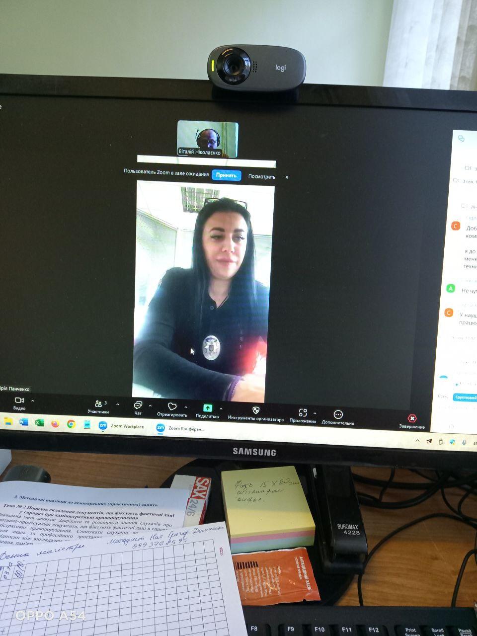 Старшим викладачем кафедри спеціальних поліцейських дисциплін та базової загальновійськової підготовки Сумської філії ХНУВС Ніколаєнком Віталієм Григоровичем було запрошено інспектора відділу адміністративної практики УПП в Сумській області старшого лейтенанта поліції Жукову Яну Станіславівну на практичне заняття з дисципліни «Практикум зі складання адміністративно-процесуальних документів» за темою «Порядок складання документів, що фіксують фактичні дані у справах про адміністративні правопорушення».