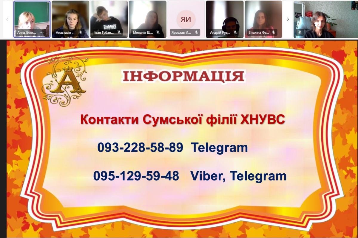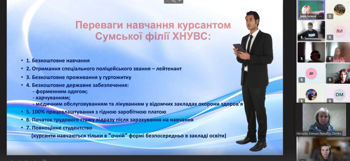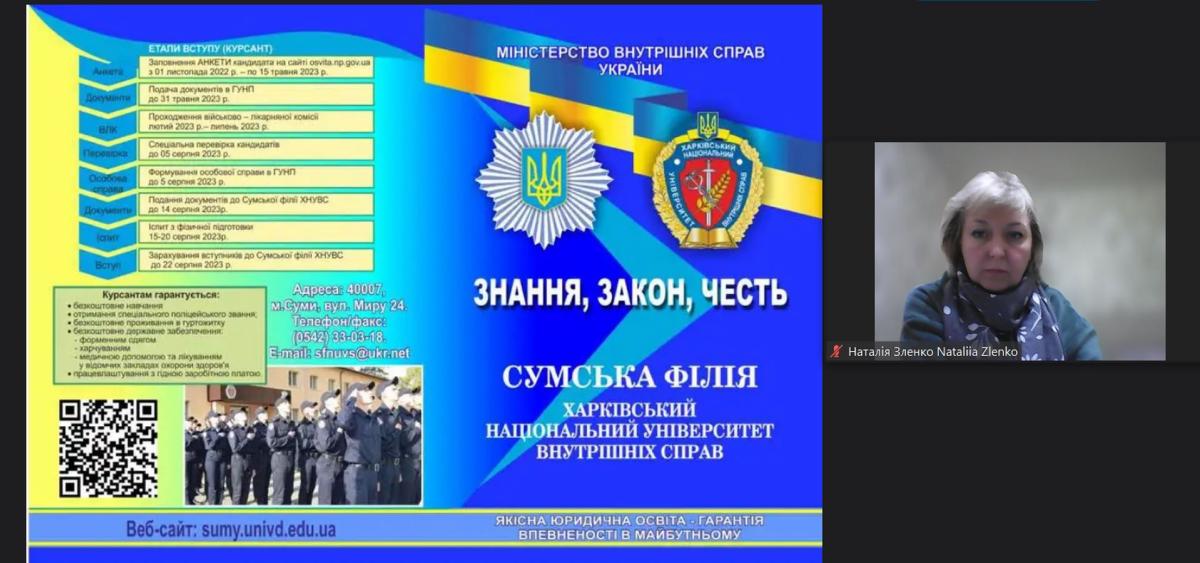 У рамках профорієнтаційних заходів кафедри гуманітарних дисциплін Сумської філії ХНУВС доцентом кафедри Зленко Наталією була організована та проведена онлайн-зустріч із учнями 11-х класів Сумського закладу загальної середньої освіти І-ІІІ ступенів № 15 Сумської міської ради.