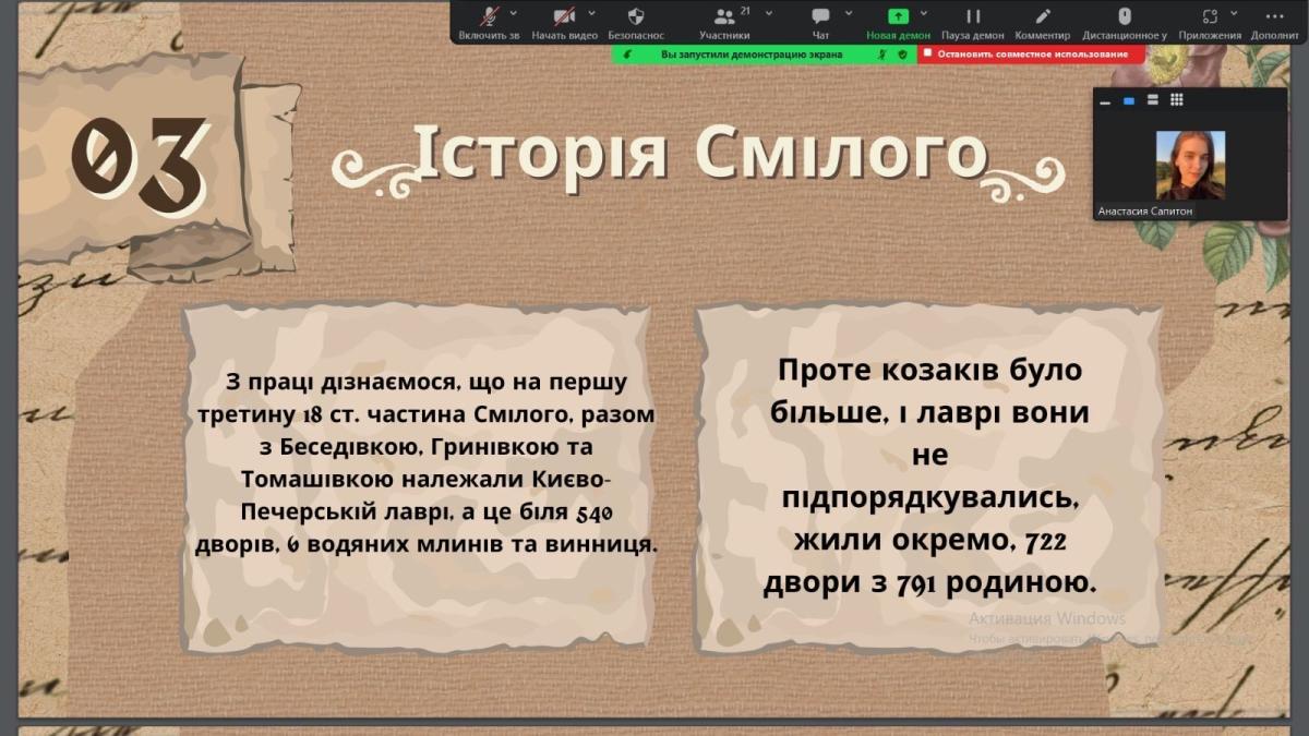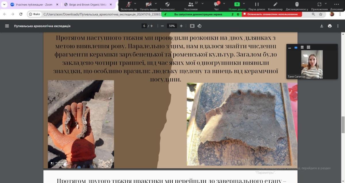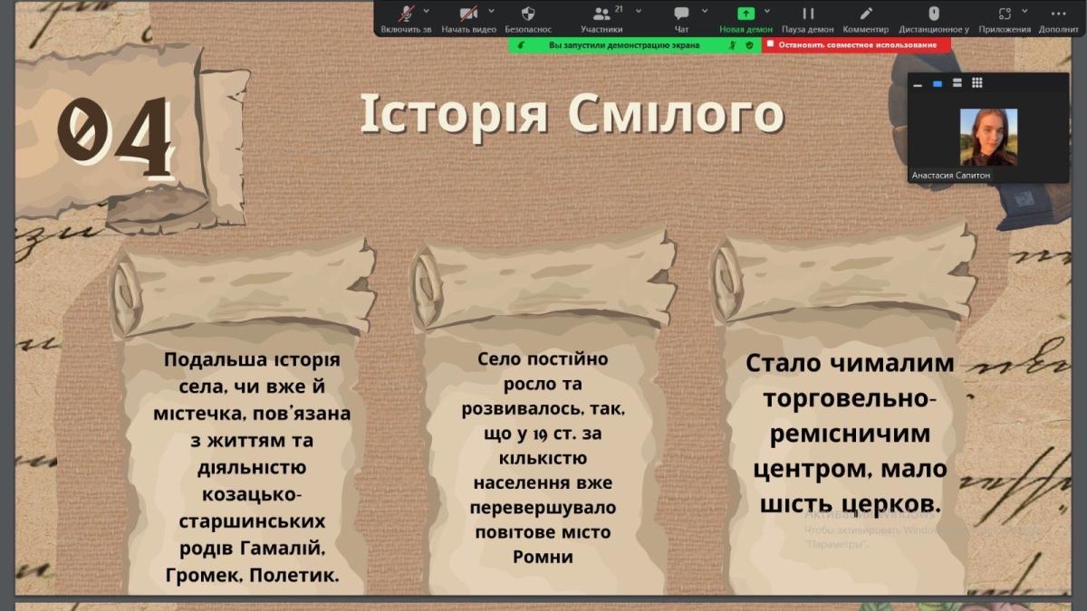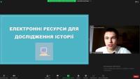 З інтересом учасники зустрічі заслухали доповідь студента Сумського державного університету Олександра Курінного на тему «Електронні ресурси для дослідження історії», адже у період безперервних повітряних тривог фонди бібліотек та архівів стали малодоступними. Зокрема, студент, який є автором ряду наукових публікацій, презентував електронні бази: «Архів українських періодичних видань»; «Міжархівний пошуковий портал»; «Карту поширення прізвищ України»; сайт репресованих осіб «Реабілітовані історією» та ін. з ресурсами яких можна працювати вдома.