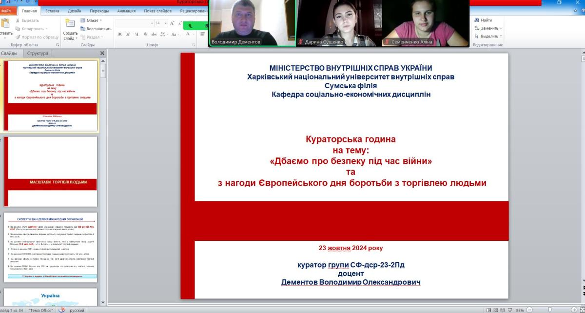 Доцент кафедри соціально-економічних дисциплін Володимир Дементов провів зі студентами групи СФ-дср-23-2Пд кураторську годину на тему «Дбаємо про безпеку під час війни» з нагоди Європейського дня боротьби з торгівлею людьми.