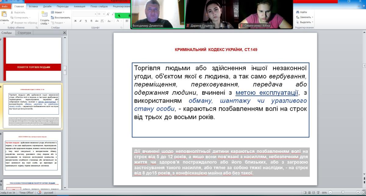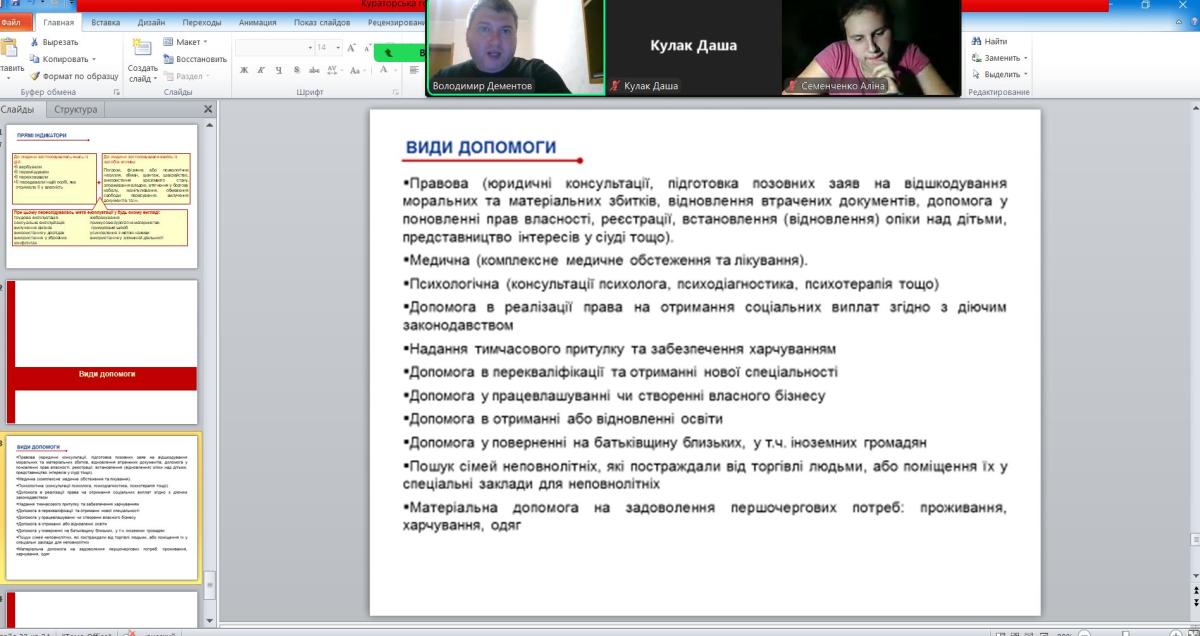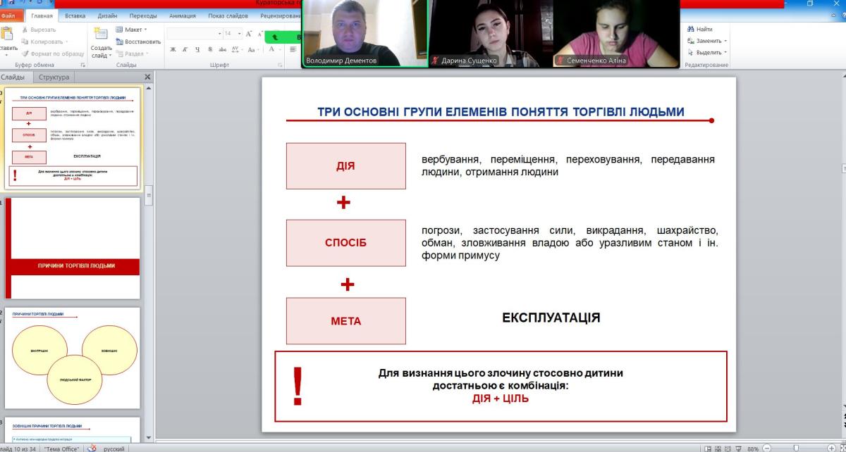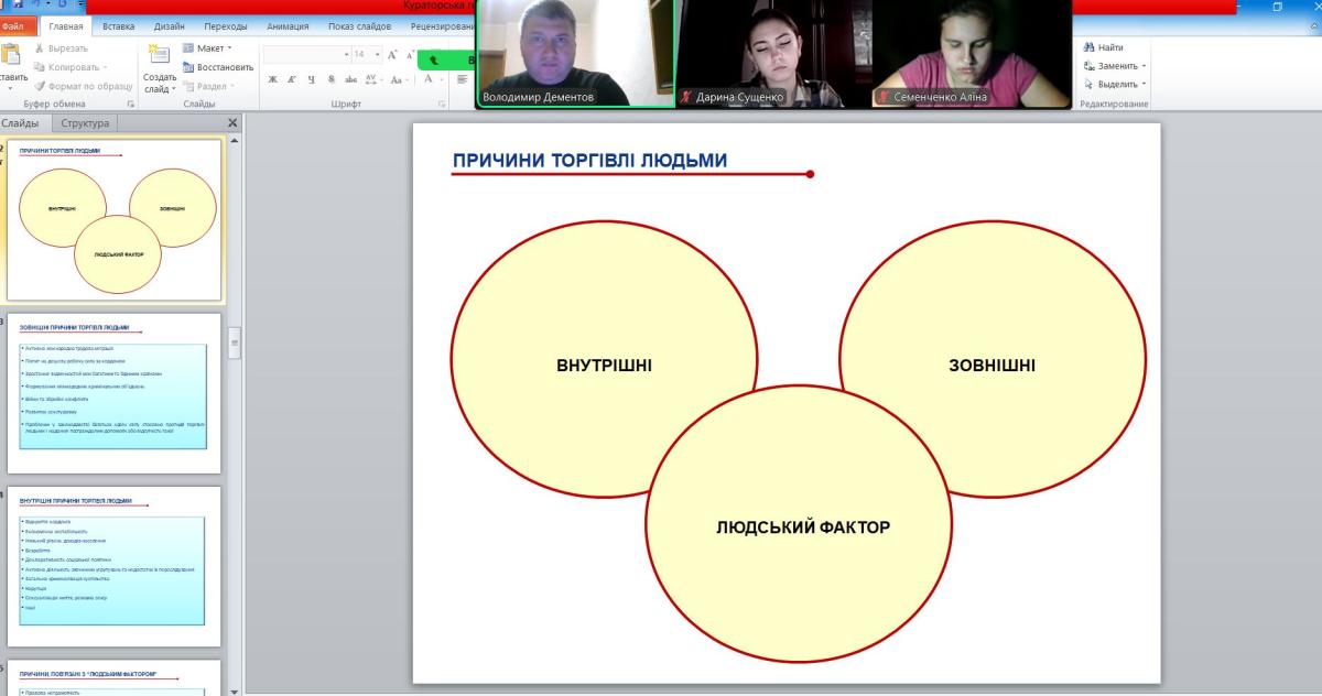 В рамках зустрічі зі студентами 2-го курсу спеціальності «Правоохоронна діяльність» розглянули такі актуальні та важливі з точки зору безпечної поведінки молоді, в тому числі в умовах невизначеності воєнного часу, як: масштаби торгівлі людьми: експертні дані міжнародних організацій; поняття торгівлі людьми, відміна торгівлі людьми від інших злочинів (відповідно до ККУ (ст.. 149) та Закону України «Про протидію торгівлі людьми»; причини торгівлі людьми (зовнішні, внутрішні, людський фактор); групи ризику торгівлі людьми; форми торгівлі людьми; наслідки торгівлі людьми – для постраждалої особи, для сім’ї постраждалої особи, для країни та суспільства; виявлення постраждалих: сутність, необхідність, складність (ідентифікація та самоідентифікація постраждалих); індикатори, що вказують на ситуацію торгівлі людьми (прямі, непрямі); види допомоги постраждалим від торгівлі людьми.