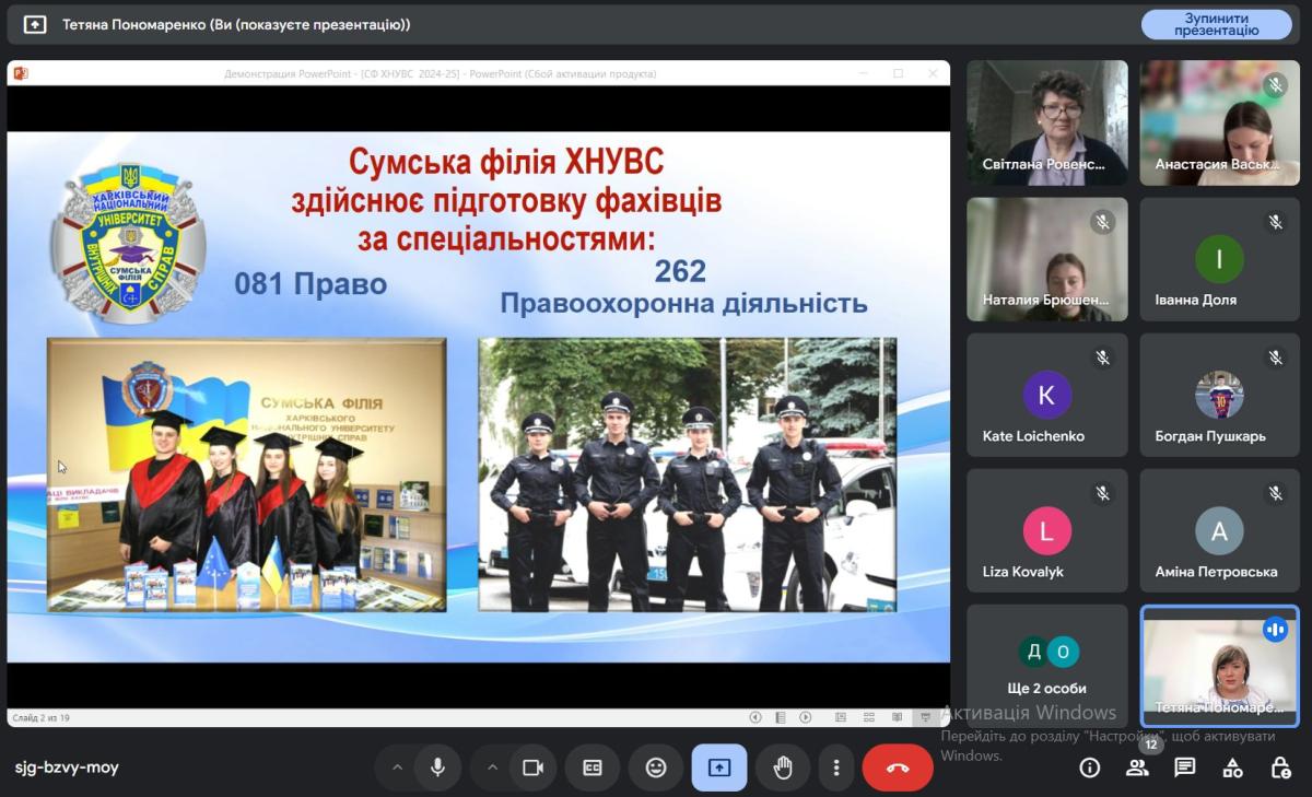 В ході зустрічі Тетяною Пономаренко було презентовано спеціальності, за якими здійснюється підготовка здобувачів вищої освіти, акцентовано увагу на перевагах навчання у Сумській філії ХНУВС.