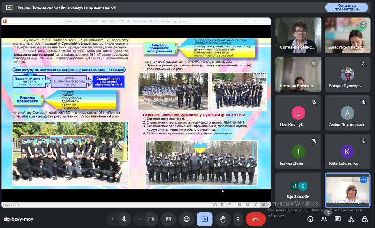 Напередодні осінніх канікул, 25 жовтня 2024 року відбувся профорієнтаційний захід із здобувачами загальної середньої освіти Лебединського закладу загальної середньої освіти І-ІІІ ступенів № 7 Лебединської міської ради Сумської області за організації доцента кафедри гуманітарних дисциплін Сумської філії ХНУВС Тетяни Пономаренко та здобувачів вищої освіти спеціальності 081 Право (поліцейські).